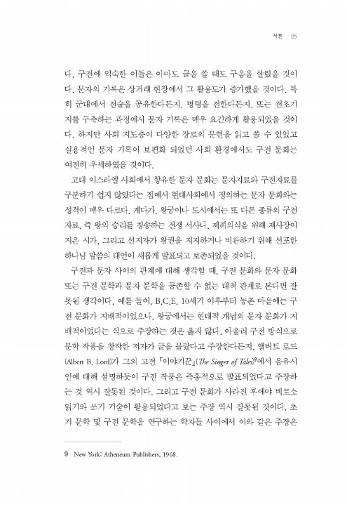 문자 문학이 관료적 행정체계를 갖춘 왕정 시대의 특징이고, 구전 문학이 가부장적 부족 사회의 특징이라는 이분법은 더 이상 이스라엘 사회에서 받아들여질 수 없다. 이스라엘의 왕정은 “베트 아브” 즉 가 부장적 가계를 그 조직의 기본원리로 했다는 것이 최근의 학자들에 의해 밝혀졌기 때문이다. 즉 이스라엘 왕정은 계급에 근거한 신분사회가 아니라, 아버지적 왕과의 개인적 관계에 따른 다기능적 평등사회였다는 것이다. 이런 사회에서 형성된 구약성경의 문자 문학이 구전 문학적 형태들을 가지게 된 것은 어쩌면 당연한 일일지 모른다.