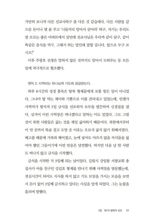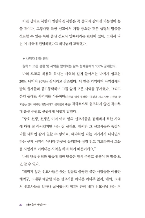 이런 상태로 북한이 열린다면 북한은 꼭 중국과 같아질 가능성이 높을 것이다. 그렇다면 북한 선교에서 가장 중요한 것은 생명의 말씀을 선포할 수 있는 북한 출신 선교사 양육이라는 판단이 섰다. 그래서 나는 이 사역에 전념하겠다고 하나님께 고백했다. _p. 29