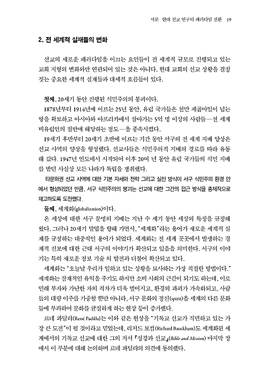 필자가 강조하고자 하는 것은 성경적인 추동력이 선교의 동기와 실천을 새로운 방향으로 몰고 가고 있다는 점이다. 또한, 필자는 타문화 선교 사역들이 석양 너머로 저물어 가고 있다고 말하고 싶지도 않다. 복음에 대한 증인이 없는 곳으로 복음을 전하러 가려는 것에 대한 관심은 교회의 선교가 지속적으로 유지해 나가야 할 선교가 갖는 중요한 측면이기 때문이다. 20세기에서 21세기에 걸쳐 발생한 극적인 변화들 때문에, 선교에 대한 전통적 패러다임이 현대라는 시대적 맥락에 더 이상 적절하지 않게 되었다고 말하려는 것뿐이다. ― 15쪽