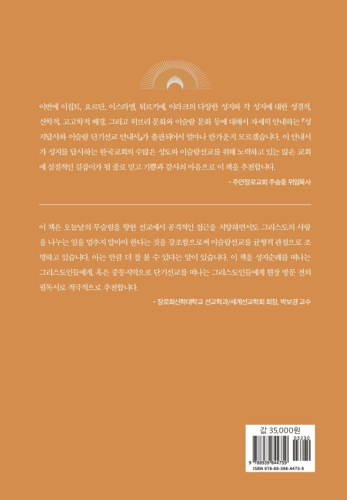 이슬람 선교에 있어서 중요한 것은 이슬람을 이해하는 것이다. 흔히 이슬람권 나라들은 다 비슷할 것이라고 생각하지만, 실상은 다르다. 이슬람권은 나라마다, 지역마다 그 상황이 복잡하고 다양하기 때문에 이슬람권 선교를 위해서는 선교지의 역사와 상황, 문화에 대해 이해하고 그에 맞게 대처해야 한다. 또한 성지답사를 갈 때 그 지역의 신학적인 배경 지식에 대해 알고 가면, 더욱더 큰 은혜를 누릴 수 있게 될 것이다. 이 책은 이집트, 요르단, 이스라엘, 튀르키예, 이라크 등 다양한 성지와 이슬람의 상황에 대해 쉽게 이해할 수 있도록 설명되어 있어 성지답사를 준비하거나 이슬람 선교를 하는 모든 이들에게 많은 도움이 될 것이다.