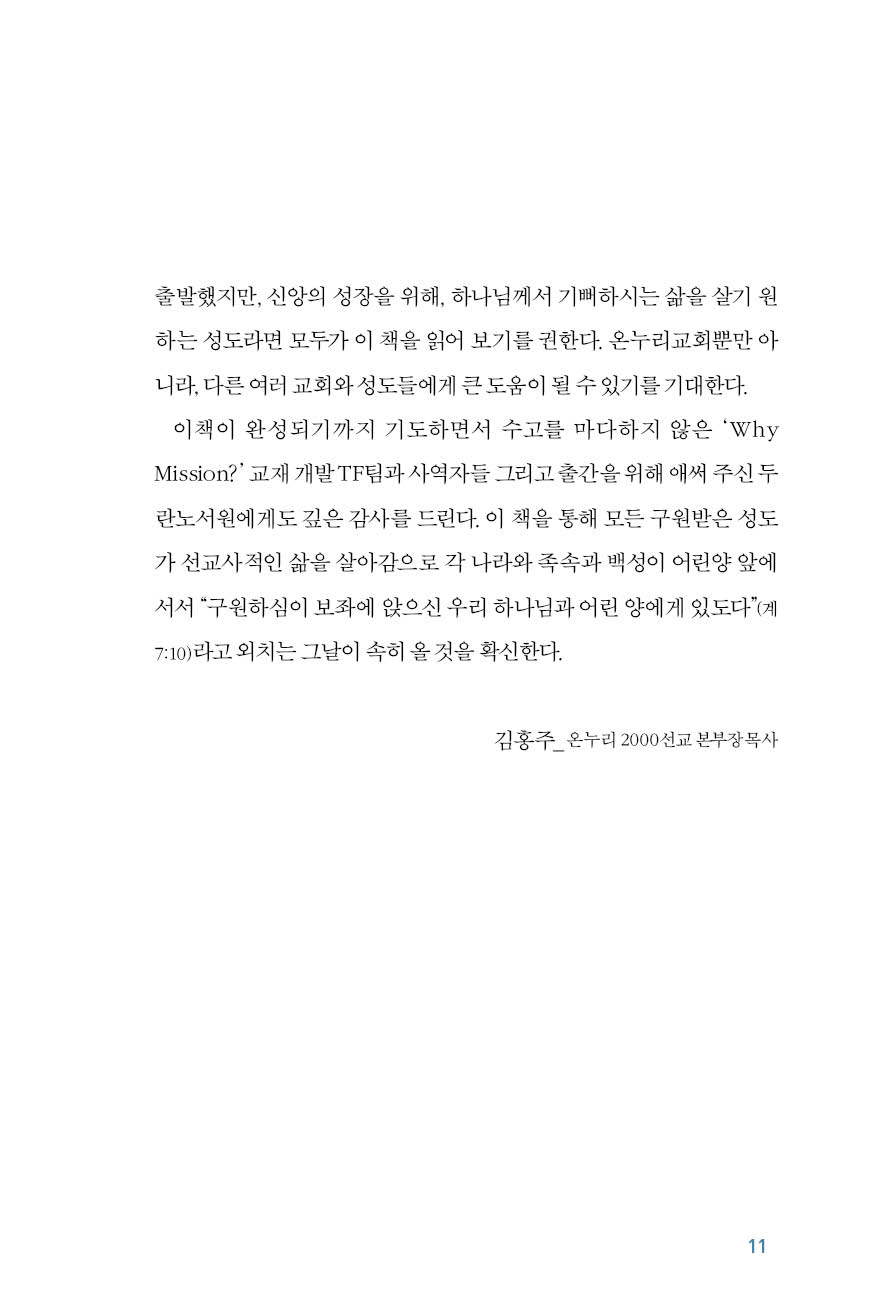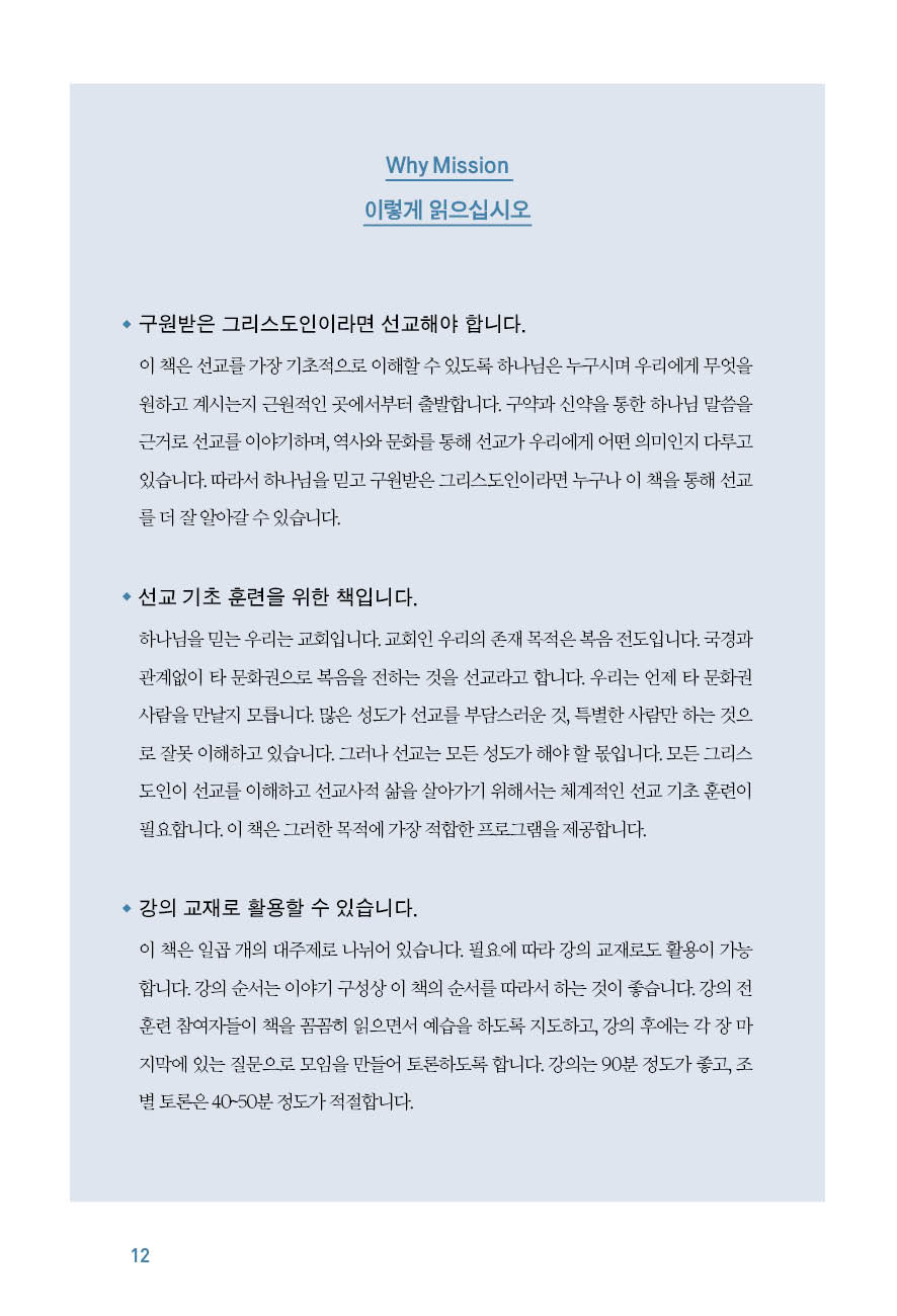 이 책에서 모든 집필진이 중점을 두었던 것은 성도가 선교를 쉽게 이해할 수 있도록 하는 것이었다. ‘Why Mission?’ 훈련 프로그램 교재에서 출발했지만, 신앙의 성장을 위해, 하나님께서 기뻐하시는 삶을 살기 원하는 성도라면 모두가 이 책을 읽어 보기를 권한다. 온누리교회뿐만 아니라, 다른 여러 교회와 성도들에게 큰 도움이 될 수 있기를 기대한다.