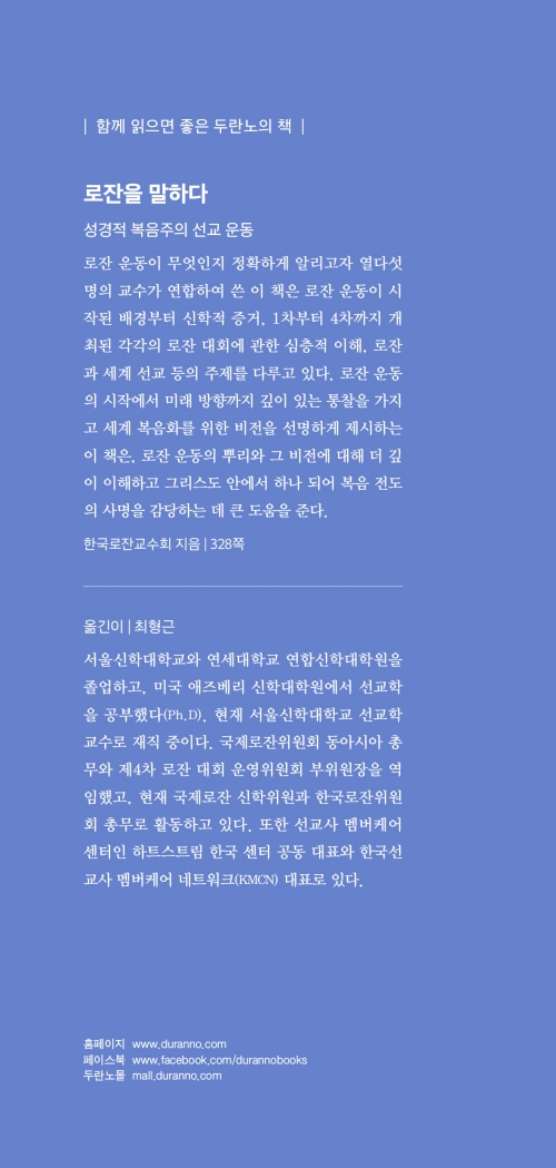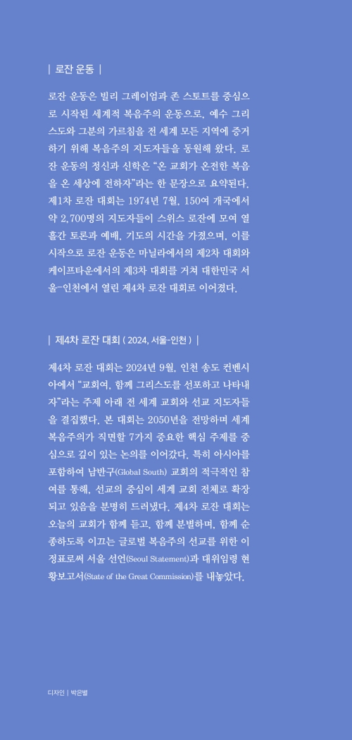 세계 선교 지형이 급격히 변화하고 있는 이 시점에서 한국에서 열린 제4차 로잔 대회 역시 이러한 시대적 변화로 인한 도전과 대응을 담지 않을 수 없었다. 이 책은 제1차 로잔 대회에서 발표된 로잔 언약부터 마닐라 선언, 케이프타운 서약, 그리고 이번 제4차 로잔 대회의 서울 선언에 이르기까지 로잔 운동의 모든 주요 선언을 한 권에 담고 있다.