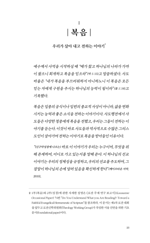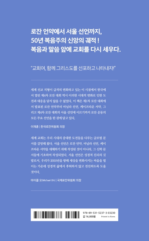 이 책은 1974년 제1차 로잔 대회에서 발표된 ‘로잔 언약’으로 시작된 복음주의 신앙의 여정을 따라, 1989년 ‘마닐라 선언’, 2010년 ‘케이프타운 서약’을 거쳐 2024년 제4차 로잔 대회에서 발표된 ‘서울 선언’에 이르기까지, 약 50년에 걸친 로잔 운동의 신학적 궤적을 한 흐름으로 담아낸 공식 문서집이다.