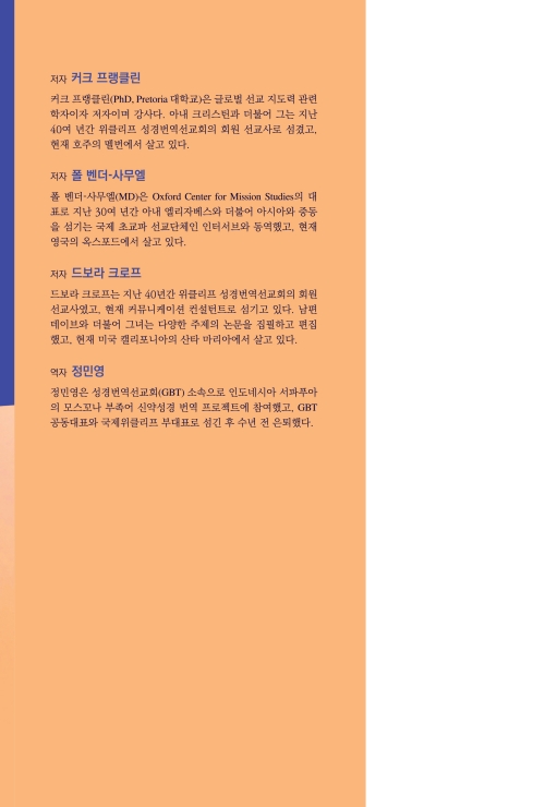 선교의 역사, 선교의 성공과 몰락, 선교 패러다임 이면의 신학이 이 귀중한 작은 책에 모두 담겨 있다! 저자들은 삼위 하나님의 삶에 순종하는, 반응적 선교신학을 형성하는 데 필요한 모든 도구를 교회에게 참된 선물로 제공하고 있다.
