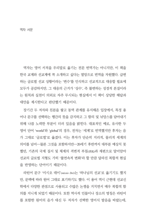 이 책은 선교의 주권이 하나님께 있음을 재확인하고, 급변하는 글로벌 선교 지형에 발맞춰 선교 신학을 재구성하고 실천하는 데 필요한 핵심 지침을 제시한다. 오늘날 글로벌 선교 현장이 직면한 복합적인 이슈들을 회피하지 않고 정면으로 다루는 이 책은 독자들이 단순한 지식 습득을 넘어 자신의 사역 현장과 신학적 배경을 비판적으로 성찰하도록 독려합니다. 특히 전통적인 서구 중심 모델과 오늘날 분절된 세계 사이의 간극을 메우는 통찰력을 제공한다.