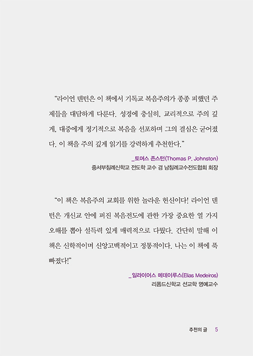 “이 책은 복음주의 교회를 위한 놀라운 헌신이다! 라이언 덴턴은 개신교 안에 퍼진 복음전도에 관한 가장 중요한 열 가지 오해를 뽑아 설득력 있게 매력적으로 다뤘다. 간단히 말해 이 책은 신학적이며 신앙고백적이고 정통적이다. 나는 이 책에 푹 빠졌다!”