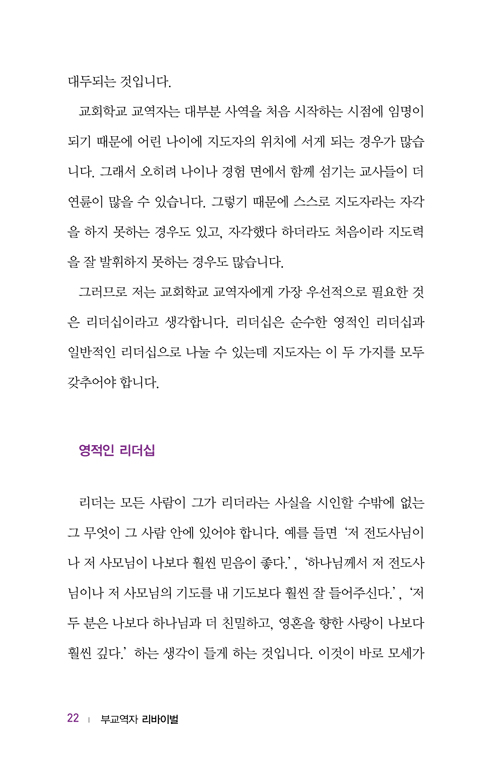 구성을 보자면 사역 대상에 맞춰 교회학교 교역자, 청년교구 교역자, 장년교구 교역자, 여성교구 교역자 편으로 나누어 각각의 입장과 상황에 맞게 설명하고 예시를 들고 있어 지극히 실제적인 지침과 조언을 얻을 수 있다.