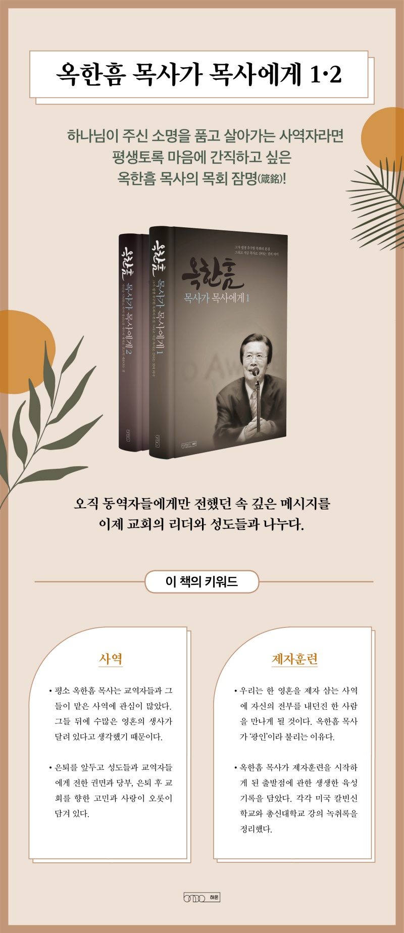 이처럼 1998년에서 2009년에 이르기까지 교역자 회의와 교역자 수양회, 훈련 사역자 특강 등 옥한흠 목사가 부교역자들에게 전한 모든 메시지를 빠짐없이 담았다. 한마디로 사역자들을 대상으로 한 메시지다. 그래서 때로는 더없이 엄격하고 철저하다. 그들 한 명 한 명 뒤에 수십 명, 수백 명에 이르는 영혼들의 건강과 생사가 걸려 있음을 알았기 때문이다.