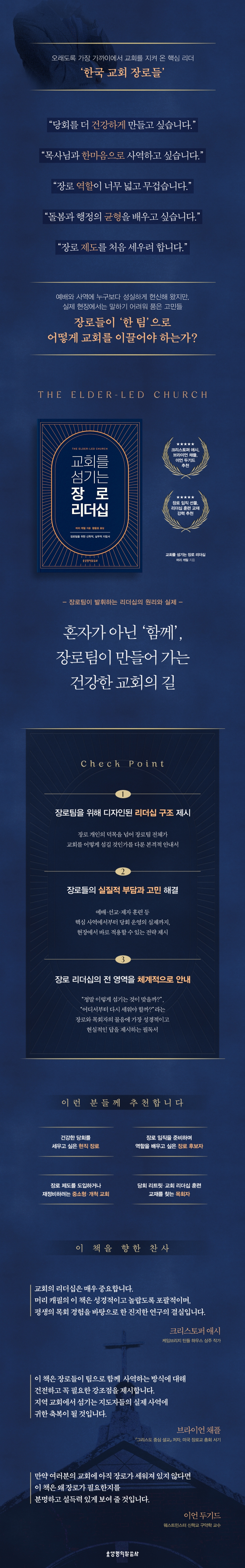 장로들이 팀으로 교회를 이끌어 가려면 교회의 방향에 대한 명확하고 공유된 이해가 필요합니다. 동시에 리더십의 의미에 대해서도 분명하고 함께 나눈 이해가 있어야 합니다. 그러지 않으면 장로들은 자신의 역할과 사역 방식을 둘러싼 숨겨진 가정들 때문에 종종 서로 엇나가게 됩니다. 이 책은 장로들이 성경에 기초하면서도 실제적인 방식으로 교회를 함께 이끌어 가는 길을 보여 줍니다. 내가 목회하던 시절에 이 책이 있었다면 얼마나 좋았을까 하는 아쉬움이 남습니다.