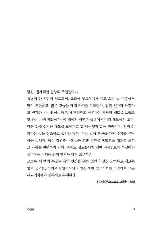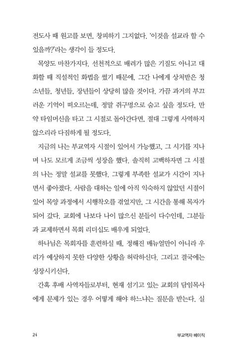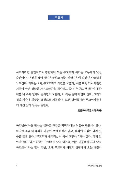 목사님을 처음 만나는 분들은 조금은 딱딱하다는 느낌을 받을 수 있다. 하지만 조금 더 대화를 나누어 보면 허례가 없고, 대화에 진심이 담겨 있음을 알게 된다. 『부교역자 베이직』, 이 책이 그렇다. “해야 한다, 하지 말아야 한다.”라는 다양한 조언들이 담겨 있는데, 이런 내용들이 그냥 담임목사로서 하는 말이 아닌, 오랜 부교역자 시절의 경험에서 오는 애정이 담긴, 실제적인 현장의 조언들이다.
