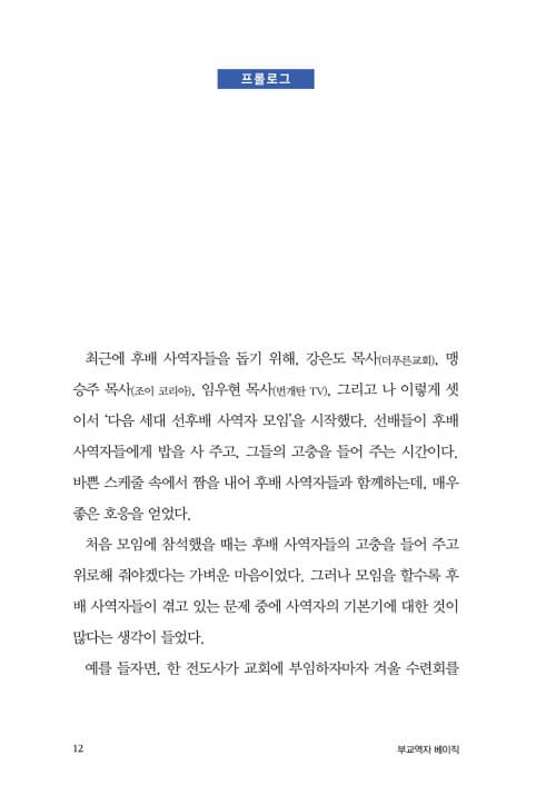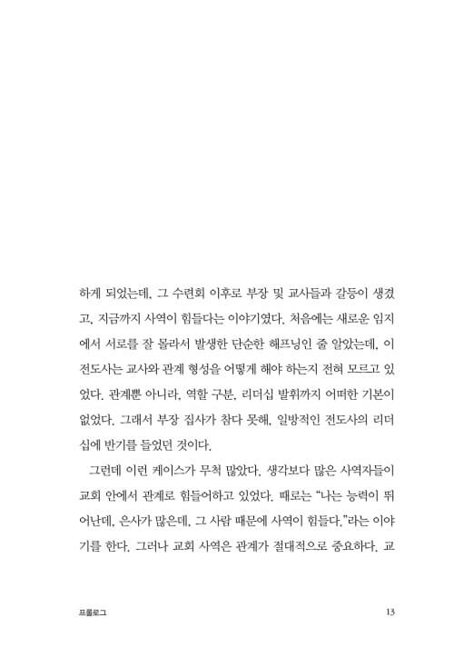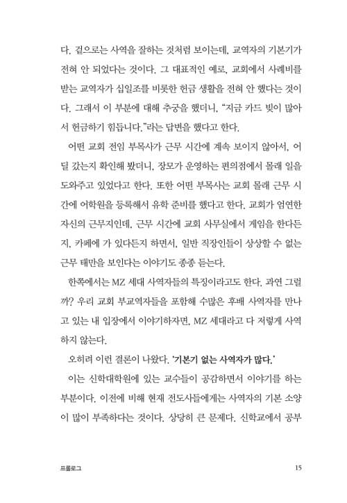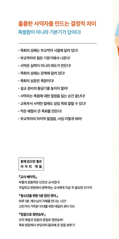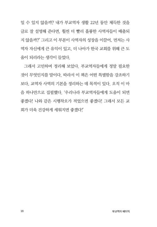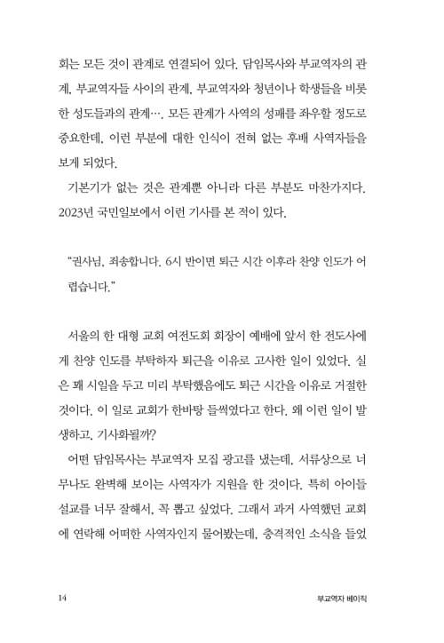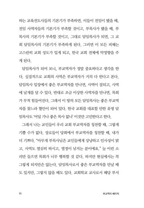 사람의 두뇌나 성품이나 인격이나 은사는 타고날 수 있지만, 교역자의 기본기는 얼마든지 배워서 채울 수 있는 부분이다. 부교역자들이 기본기를 제대로 배우기만 한다면 지금보다 훨씬 훌륭한 사역자로 성장할 것이다.