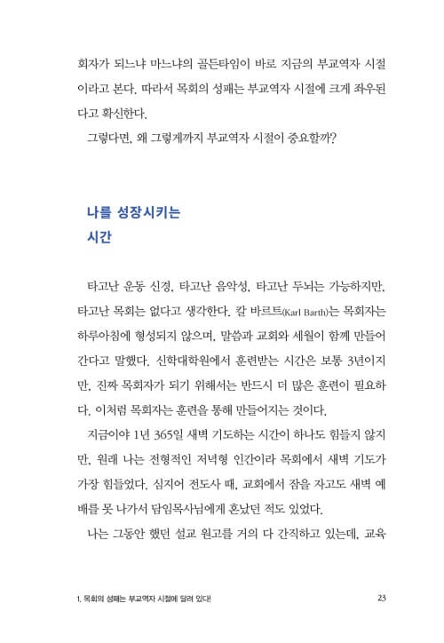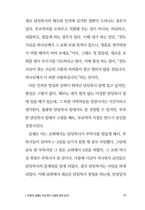 처음부터 목회를 잘하는 사람은 존재하지 않는다. 부교역자 시절은 목회자로 성장을 시키는 시간이다. 특히 목회는 이론만으로 이루어지지 않기에, 현장에서의 경험은 많을수록 도움이 된다. 실수조차도 큰 도움이 된다. 목회자로 성장하기 위한 부교역자 시절의 성장통은 피할 수 없는 과정이다.