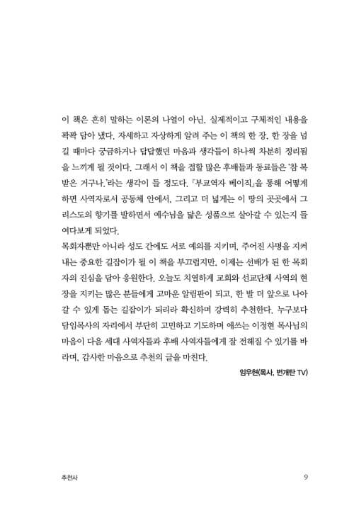 이정현 목사님이 후배 교역자들을 뜨겁게 사랑하는 마음으로 귀한 책을 쓰셨다. 저자는 부교역자로서 사역을 감당한 경험을 바탕으로 생생한 목회 현장의 이야기를 우리에게 전해 주고 있다. 이 책은 부교역자가 지녀야 할 자세와 태도와 책임, 그리고 해야 할 구체적인 역할에 대해 자세하게 알려 주는 매뉴얼과 같다. 이 책은 부교역자를 대상으로 쓰였지만, 모든 교역자가 읽고 깨닫고 실천해야 하는 책이라는 확신이 든다. 하나님께서 기뻐하시는 교역자, 성도들로부터 사랑받는 교역자가 되고 싶은 분들에게 이 책을 강력하게 추천한다.