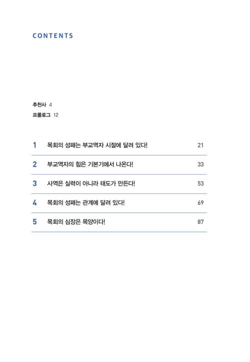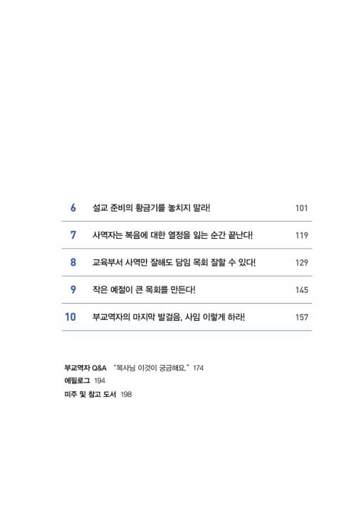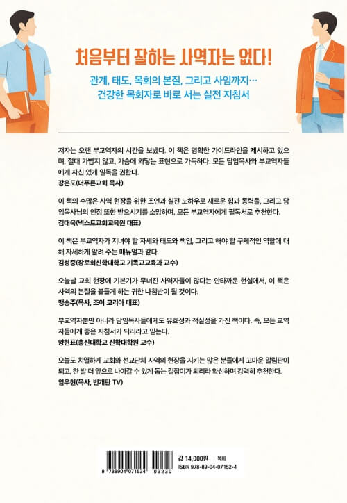 모쪼록 이 책의 수많은 사역 현장을 위한 조언과 실전 노하우로 새로운 힘과 동력을, 그리고 담임목사님의 인정 또한 받으시기를 소망하며 모든 부교역자에게 필독서로 추천한다.