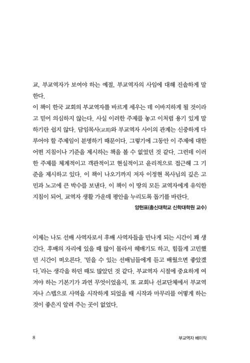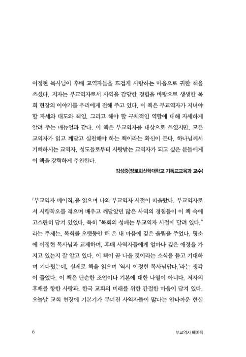 이제는 나도 선배 사역자로서 후배 사역자들을 만나게 되는 시간이 꽤 생긴다. 후배의 자리에 있을 때 많이 몰라서 헤매기도 하고, 힘들게 고민했던 시간이 떠오른다. ‘믿을 수 있는 선배님들에게 듣고 배웠으면 좋았겠다.’라는 생각을 하던 때도 많았던 것 같다. 부교역자 시절에 중요하게 여겨야 하는 기본기가 과연 무엇이었을지, 또 교회나 선교단체에서 부교역자나 스텝으로 사역을 시작하게 되었을 때 시작과 마무리를 어떻게 하는 것이 좋은지 알려 주는 곳이 없었다. 이 책은 흔히 말하는 이론의 나열이 아닌, 실제적이고 구체적인 내용을 꽉꽉 담아 냈다. 자세하고 자상하게 알려 주는 이 책의 한 장, 한 장을 넘길 때마다 궁금하거나 답답했던 마음과 생각들이 하나씩 차분히 정리됨을 느끼게 될 것이다. 그래서 이 책을 접할 많은 후배들과 동료들은 ‘참 복받은 거구나.’라는 생각이 들 정도다. 『부교역자 베이직』을 통해 어떻게 하면 사역자로서 공동체 안에서, 그리고 더 넓게는 이 땅의 곳곳에서 그리스도의 향기를 발하면서 예수님을 닮은 성품으로 살아갈 수 있는지 들여다보게 되었다.