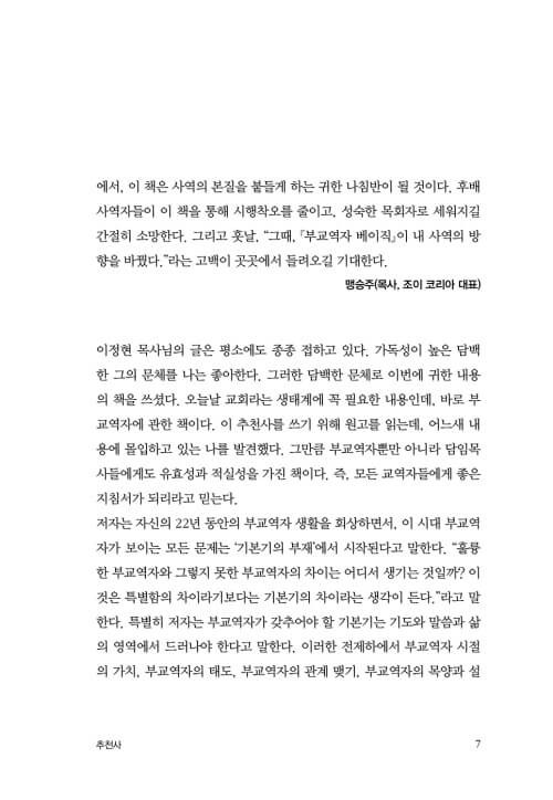 이 책이 한국 교회의 부교역자를 바르게 세우는 데 이바지하게 될 것이라고 믿어 의심하지 않는다. 사실 이러한 주제를 놓고 이처럼 용기 있게 말하기란 쉽지 않다. 담임목사(교회)와 부교역자 사이의 관계는 신중하게 다루어야 할 주제임이 분명하기 때문이다. 그렇기에 그동안 이 주제에 대한 어떤 지침이나 기준을 제시하는 책을 볼 수 없었던 것 같다. 그런데 이러한 주제를 체계적이고 객관적이고 현실적이고 윤리적으로 접근해 그 기준을 제시하고 있다. 이 책이 나오기까지 저자 이정현 목사님의 깊은 고민과 노고에 큰 박수를 보낸다. 이 책이 이 땅의 모든 교역자에게 유익한 지침이 되어, 교역자 생활 가운데 평안을 누리도록 돕기를 바란다.