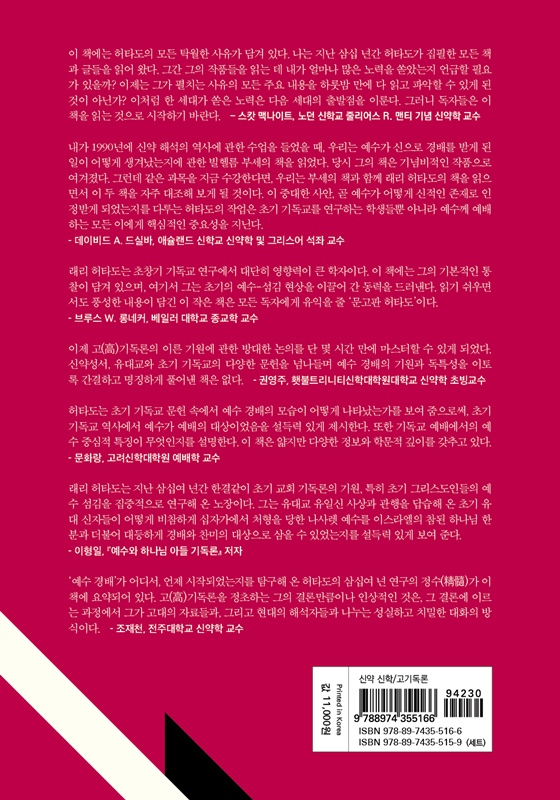이제 고(高)기독론의 이른 기원에 관한 방대한 논의를 단 몇 시간 만에 마스터할 수 있게 되었다. 신약성서, 유대교와 초기 기독교의 다양한 문헌을 넘나들며 예수 경배의 기원과 독특성을 이토록 간결하고 명징하게 풀어낸 책은 없다.
