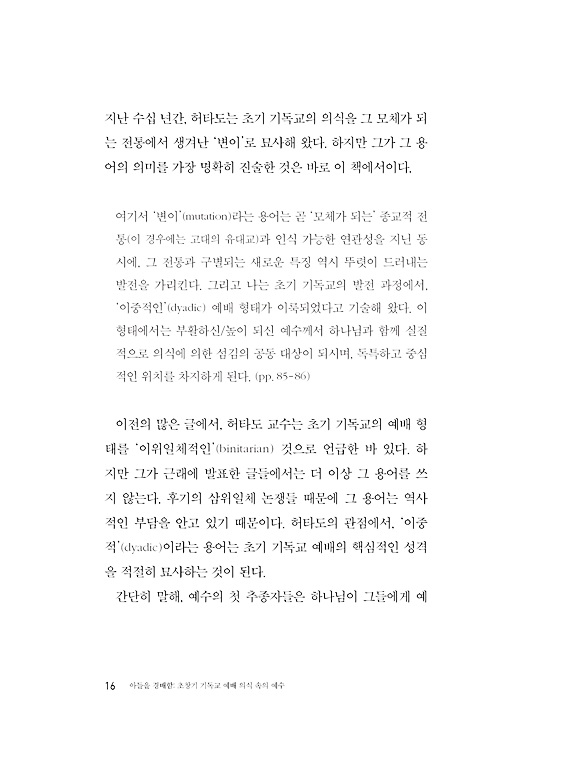 (초기 기독교를 연구하는 다른 많은 학자들과 함께) 신약학자들은 자주 예배가 갖는 의미를 간과하거나 그 중요성을 경시하는 경향을 보여 왔다. 그 대신에 그들은 예수의 기독론적 칭호 또는 그에 관한 믿음의 다른 표현들에 주로 초점을 맞추곤 한다. 물론 나도 이런 사안들이 분명히 중요한 것들임을 인정한다. 하지만 이제 논의하려는 대로, 나는 초창기의 기독교 예배에서 나타난 현상들, 특히 부활하신 예수가 예배에서 어떤 존재로 제시되었는지에 중점을 두고 살피려 한다. _ p. 23