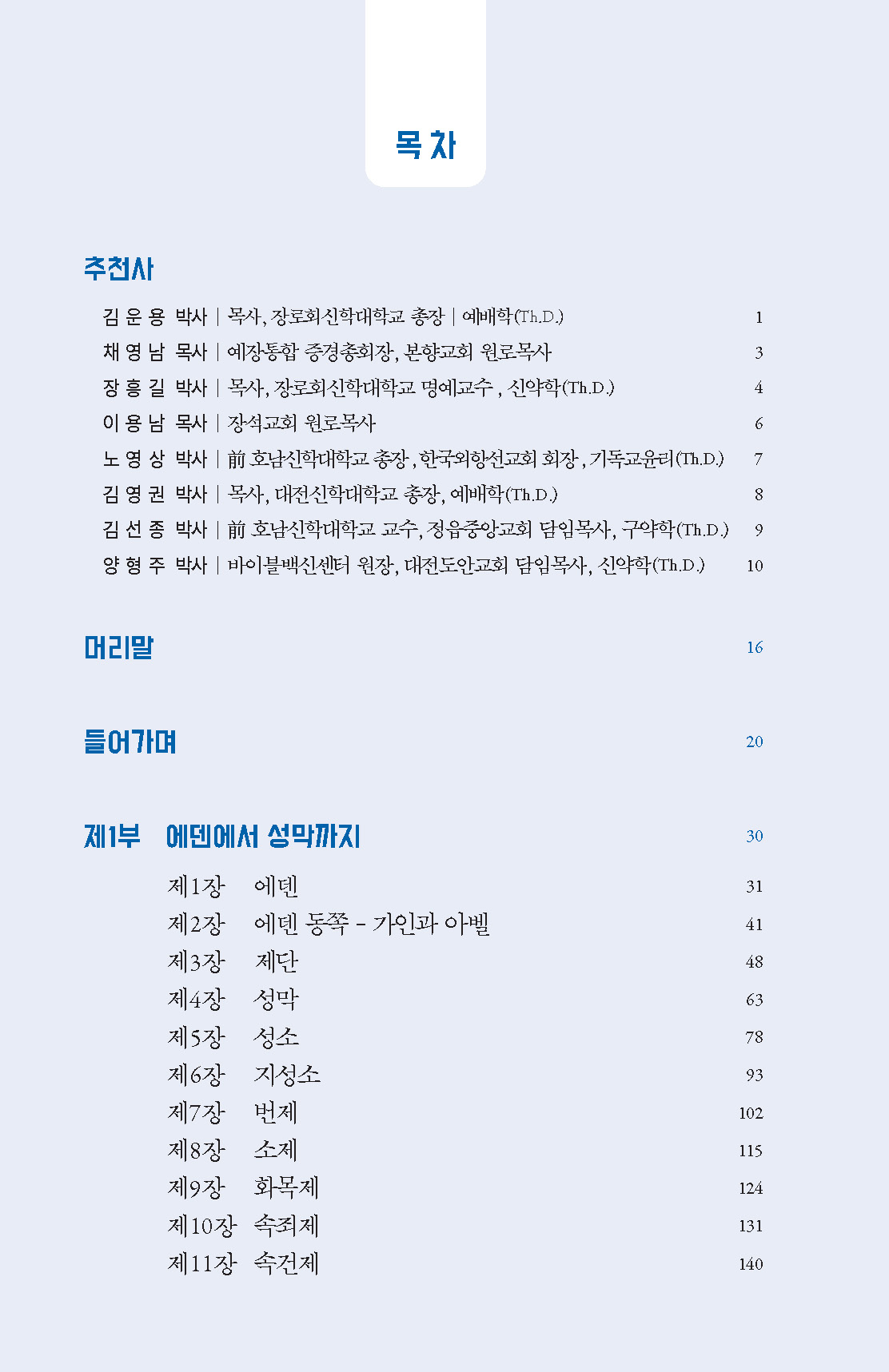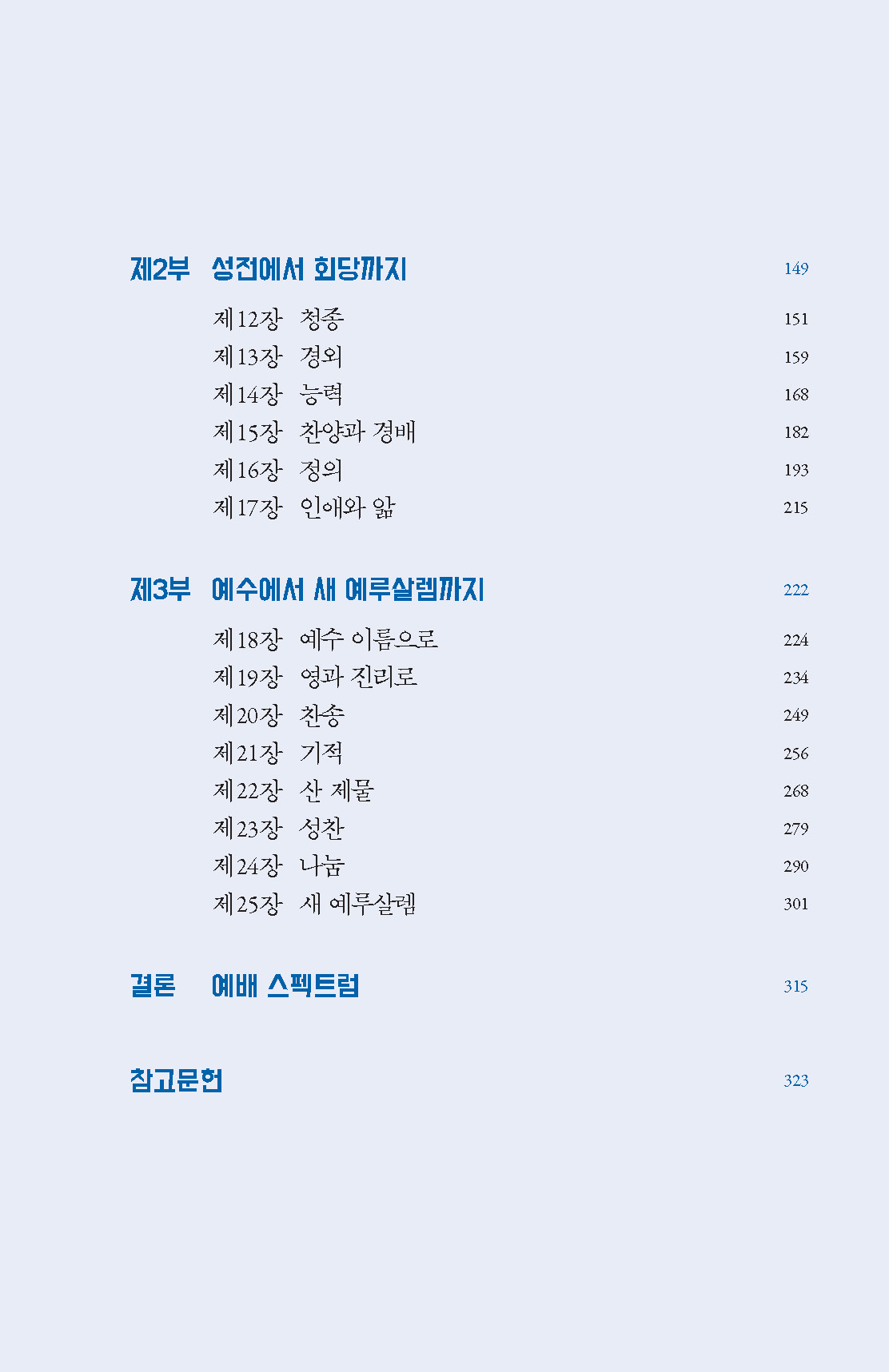 부제(Worship: From Eden to New Jerusalem)가 말해 주듯이 창세기에서부터 요한계시록까지 25개 성경 본문을 분석하여, 40가지 예배 가치들로 정리하였다. ‘예배 가이드북’으로서 이 책은 독자들에게 참된 예배자의 길을 안내하는 길라잡이가 될 것이다.