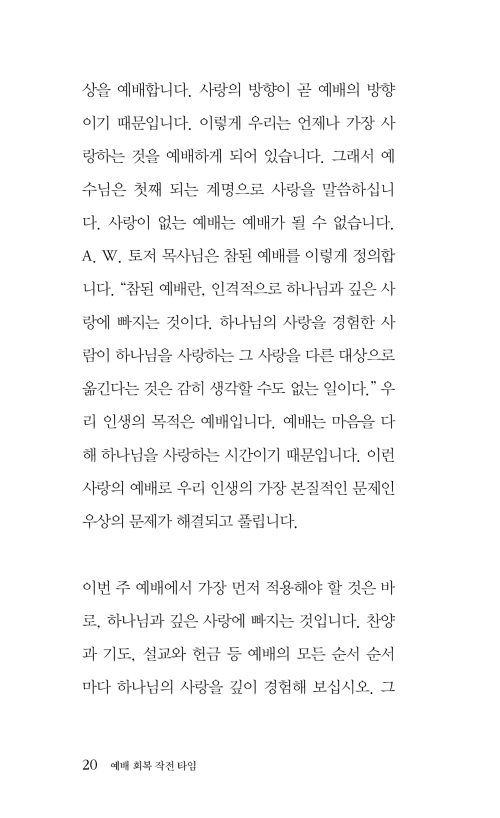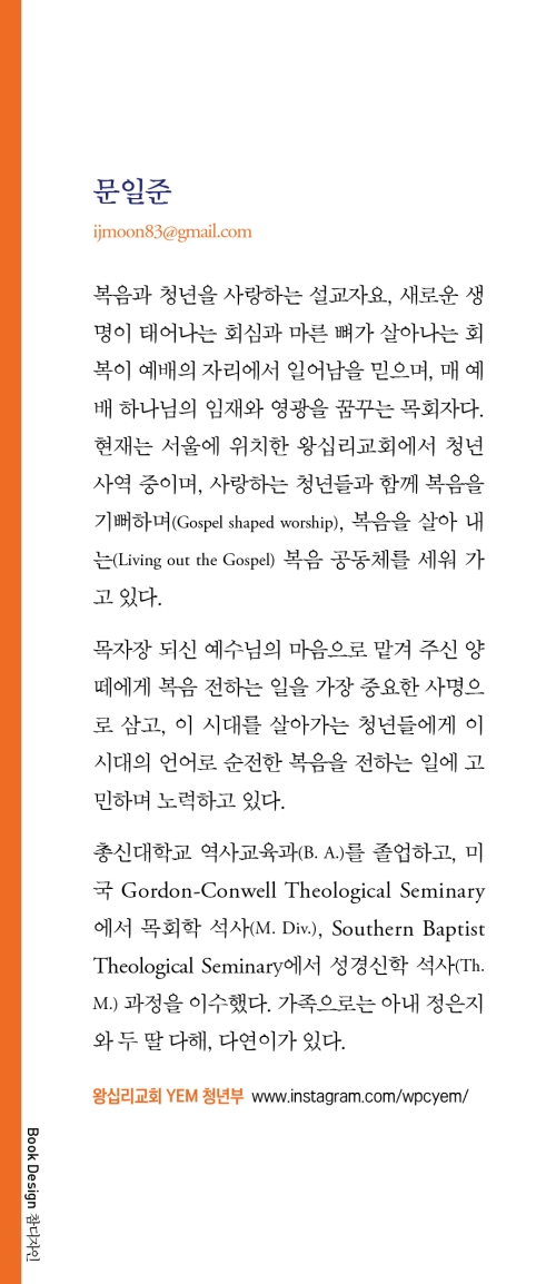 이 글이 이론서가 아닌 실전서로 쓰일 수 있도록 ‘예배 회복을 위한 작전 타임’의 자리를 치열하게 지켜 준 사랑하는 왕십리교회 YEM 청년부 리더들과 청년들에게 진심으로 감사의 마음을 전한다. 또한 무모해 보이는 한 청년 공동체의 예배 회복을 위한 실험과 도전을 책으로 엮어 주신 강인구 대표님께도 깊이 감사드린다. 언제나 기도로 가장 큰 힘이 되어 주시는 사랑하는 부모님, 장인 장모님, 그리고 하나님께서 주신 최고의 선물인 사랑하는 아내 정은지와 두 딸, 다해, 다연이에게 빚진 자의 마음으로 감사의 마음을 전한다.