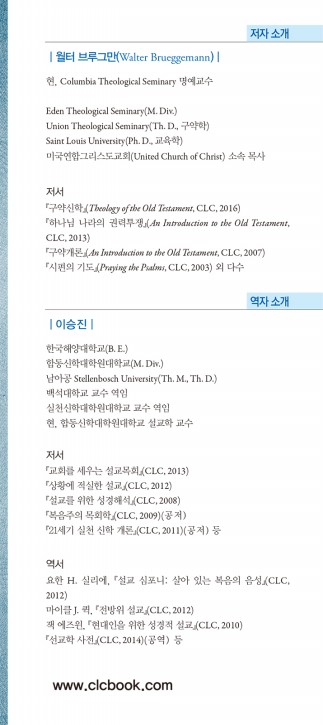 월터 브루그만은 하나님의 말씀이 기록되고 들려지던 당시의 삶의 자리를 사회학적으로 조망하는 방법을 통해 성경 텍스트를 새로운 시선으로 바라보고, 당시에 그것이 어떻게 들려졌는지에 깊은 관심을 갖는 수사학적 연구를 통해 메시지의 깊이를 드러내도록 계속해서 요구해 왔다. 본서 또한 성경 본문 속에서 문제의 핵심을 발견하고 또한 그 안에서 해결책을 찾고자 고민하면서 또한 오늘 이 시대의 희망을 조망하려는 저자의 끈질긴 애씀의 흔적이 곳곳에 묻어있음을 발견할 수 있는 책이다.