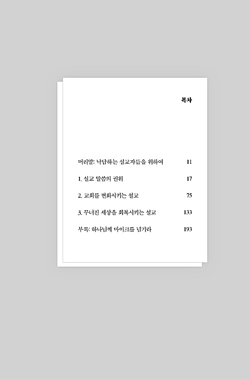 이 책은 보통의 지역 교회에서 보통의 교인들에게 정기적으로 설교하는 보통의 목회자들을 위하여 쓰였다. 혹 아직까지 설교자로서 명성을 꿈꾸고 있을지 모르지만 사실상 그런 운명에서 뒤로 밀려난 우리 대부분의 목회자들은 우리가 소망하는 것보다 더 작은 규모의 회중을 상대로 설교한다. 게다가 대부분은 예외 없이 우리가 목회 사역에 처음 발을 디디면서 소망한 것보다 훨씬 더 고달픈 상황에서 설교한다. 때로는 교인들의 무관심 또는 냉대에 지치고, 때로는 전혀 수그러들 줄 모르는 교회 리더십들의 지속적인 압력과 난관에 시달리다가 주저앉기도 한다. 우리가 일주일 내내 설교를 준비하고 주일 이른 아침부터 설교를 전할 때, 우리 등 뒤에서 가끔은 속삭이는 소리가 들리기도 한다. ‘이게 정말 일주일 내내 수고할 가치가 있는 일일까? (14)