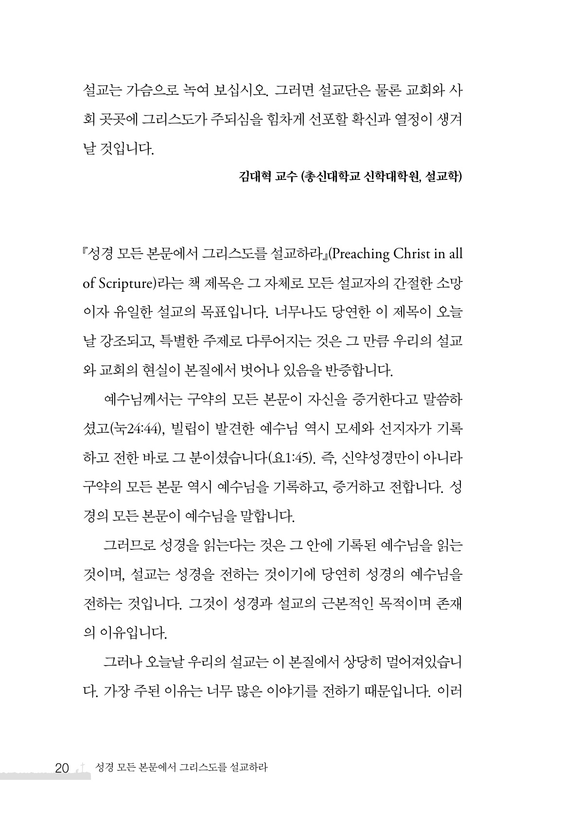 『모든 성경에서 그리스도를 설교하기』(Preaching Christ in all Scripture)라는 책 제목은 그 자체로 모든 설교자의 간절한 소망이자 유일한 설교의 목표입니다. 너무나도 당연한 이 제목이 오늘날 강조되고, 특별한 주제로 다루어지는 것은 그 만큼 우리의 설교와 교회의 현실이 본질에서 벗어나 있음을 반증합니다.
