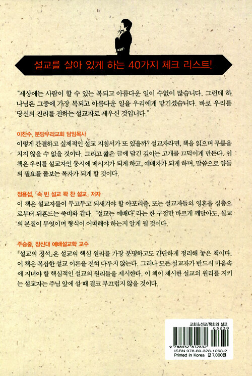 설교에 관한 책은 이미 수없이 많이 나와 있다. 그것은 그만큼 설교가 모든 사역자의 관심 분야라는 방증이다. 사역자라면 누구나 설교를 중요하게 여기고, 설교 준비에 가장 많은 에너지를 쏟을 것이다. 설교를 잘 준비해서 영혼을 살리고 교회를 살리고자 할 것이다. 하지만 이 책이 어떻게 설교를 준비해야 하는지 알려주는 책은 아니다. 어떤 설교법이 가장 효과적인지 알려주는 책도 아니다. 그저 설교할 때 해야 할 일과 하지 말아야 할 일, 즉 설교의 핵심 원리를 간결하면서도 실제적으로 제시할 뿐이다. 그렇지만 설교를 하는 사람이라면, 혹은 설교를 듣는 사람도 이 책이 말하는 원리들을 따라가며 깊이 공감할 것이다. 우리를 탁월한 설교자로 만들어주는 책은 아닐지라도, 설교자라면 지켜야 할 원리만큼은 분명하게 제시하는 책이다. 살아 있는 설교, 그것은 여전히 설교자의 입을 통해 선포되는 하나님의 말씀에 대한 기대를 가지고 교회를 찾는 모든 이가 품은 바람이기도 하다. 이 책은 분명 쉽게 읽을 수 있다. 하지만, 결코 쉽게 읽혀 버려서는 안 되는 책이다.