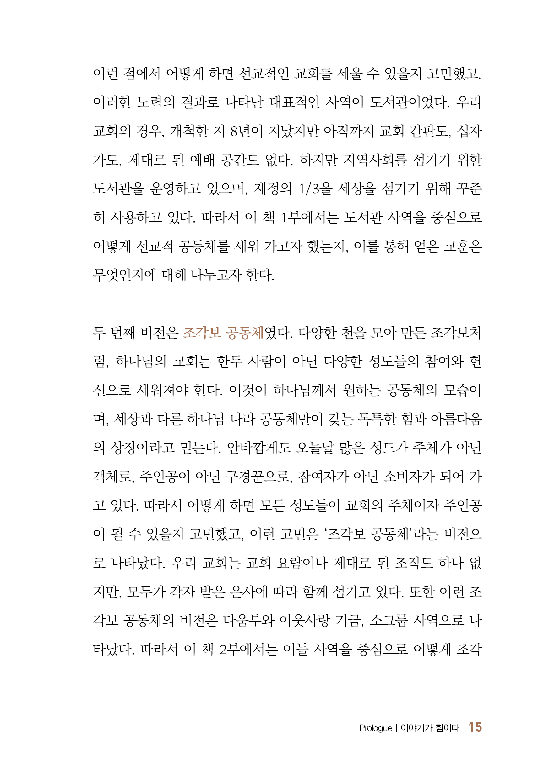 두 번째 비전은 조각보 공동체였다. 다양한 천을 모아 만든 조각보처럼, 하나님의 교회는 한두 사람이 아닌 다양한 성도들의 참여와 헌신으로 세워져야 한다. 이것이 하나님께서 원하는 공동체의 모습이며, 세상과 다른 하나님 나라 공동체만이 갖는 독특한 힘과 아름다움의 상징이라고 믿는다. 안타깝게도 오늘날 많은 성도가 주체가 아닌 객체로, 주인공이 아닌 구경꾼으로, 참여자가 아닌 소비자가 되어 가고 있다. 따라서 어떻게 하면 모든 성도들이 교회의 주체이자 주인공이 될 수 있을지 고민했고, 이런 고민은 ‘조각보 공동체’라는 비전으로 나타났다. 우리 교회는 교회 요람이나 제대로 된 조직도 하나 없지만, 모두가 각자 받은 은사에 따라 함께 섬기고 있다. 또한 이런 조각보 공동체의 비전은 다움부와 이웃사랑 기금, 소그룹 사역으로 나타났다. 따라서 이 책 2부에서는 이들 사역을 중심으로 어떻게 조각보 공동체라는 비전을 이루고자 했는지를 다루게 될 것이다.