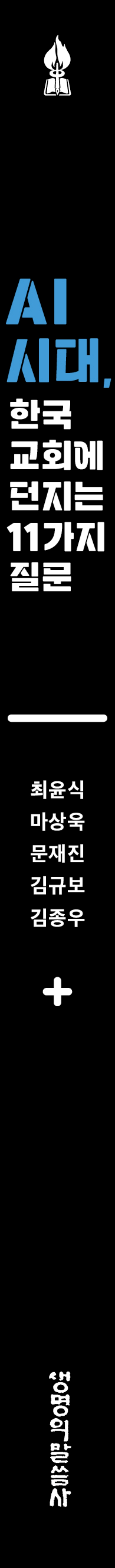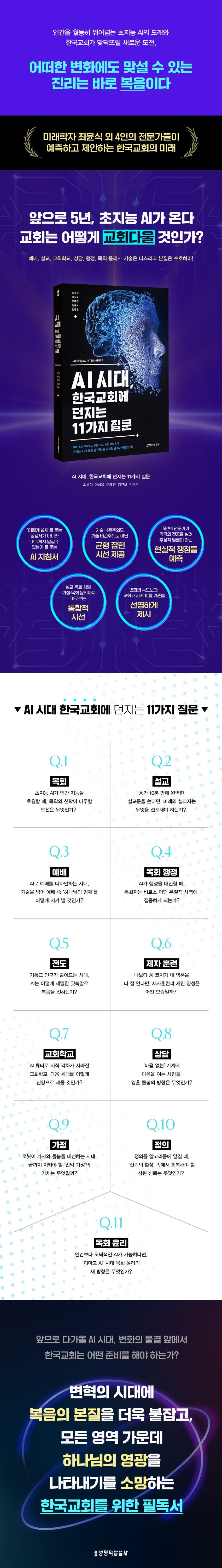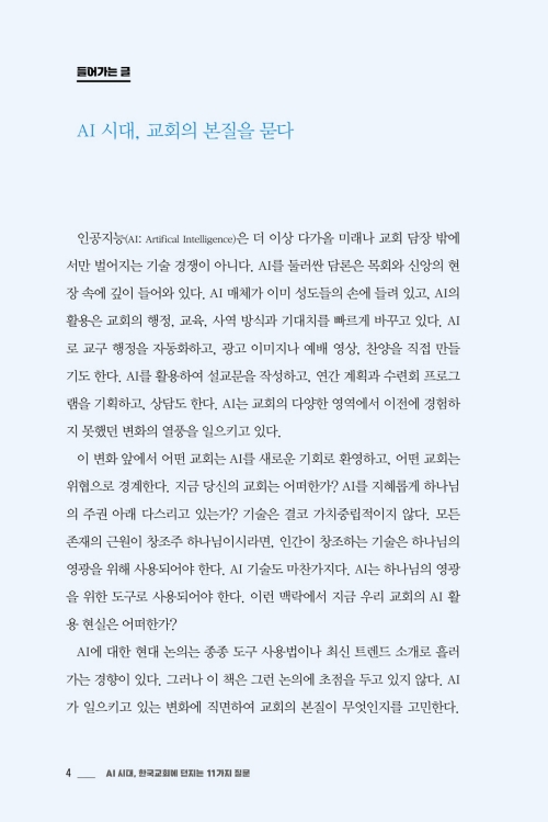 『AI 시대, 한국교회에 던지는 11가지 질문』은 기술 활용의 찬반을 넘어, AI 앞에서 교회가 반드시 고민하고 기준을 세워가야 할 신학적·목회적 물음을 제시한다. 이 책은 ‘AI를 어떻게 사용할 것인가’와 더불어 ‘AI 시대에도 변하지 않아야 할 교회의 본질은 무엇인가’라는 질문을 함께 생각한다. 목회자와 신학생은 물론, 교회의 미래를 고민하는 평신도 리더들에게도 중요한 사유의 계기를 제공할 것이다.