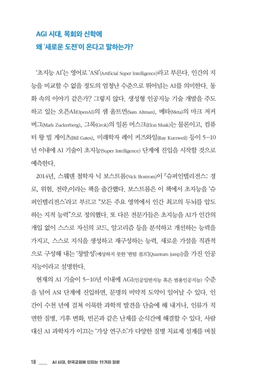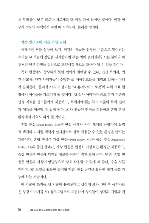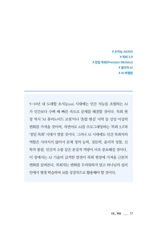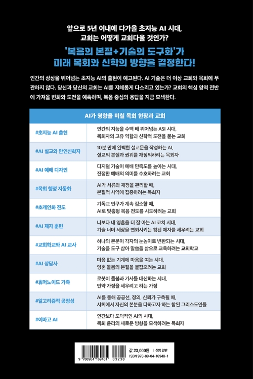 5년 이내에 인간의 두뇌를 월등히 뛰어넘는 초지능 AI가 등장하면 문명의 비약적 도약이 일어날 수 있다. 목회 역시 새로운 도전을 맞닥뜨릴 것이다. 저자들은 2030년 가상의 목회 시나리오를 제시하며 우리에게 도구를 활용함과 동시에 변화에 대비한 본질의 중요성을 일깨운다. 이 책에서 다루는 질문들은 구체적이다. AI가 ‘완벽한’ 설교문을 작성할 수 있는 시대에 설교자의 역할은 무엇인지, 나보다 나를 더 잘 아는 AI 코치가 나의 개인 영성을 담당하게 될지, 휴머노이드가 가족이 되는 시대에 ‘언약 가정’의 질서는 무엇인지 등 한국교회가 더 이상 미룰 수 없는 질문들을 정면으로 다룬다.