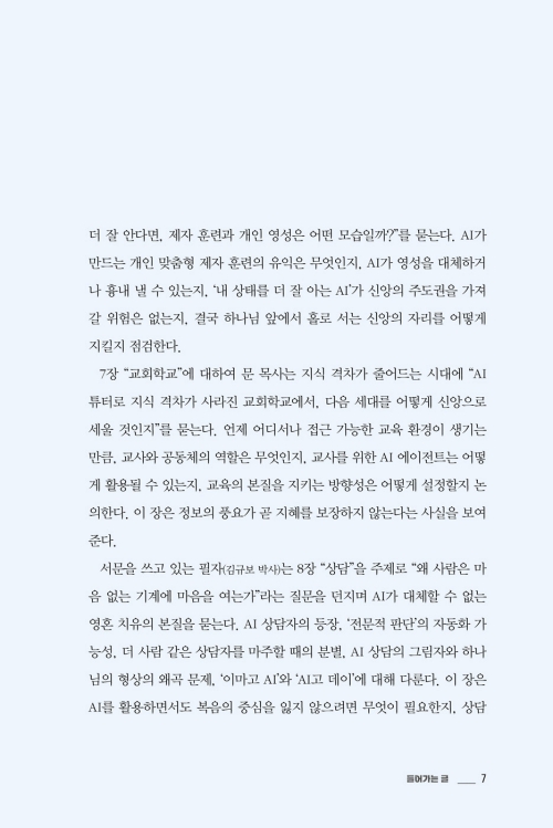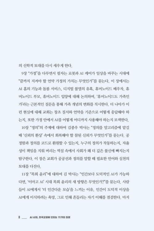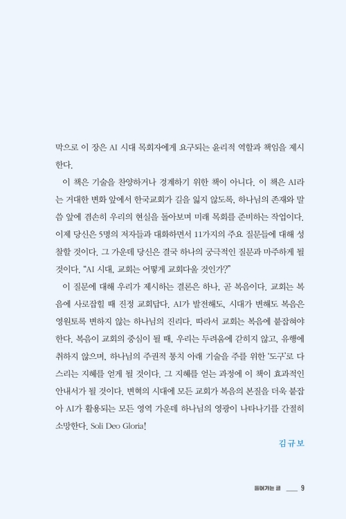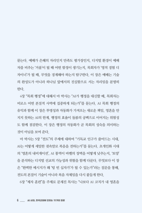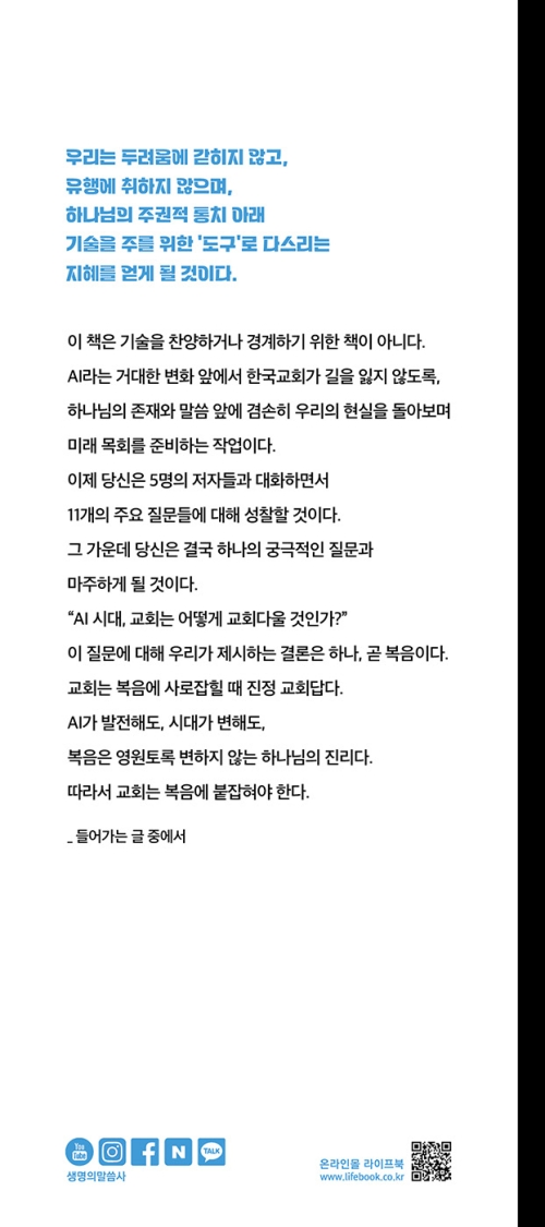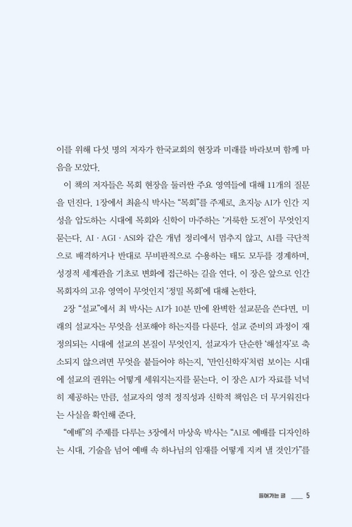 이 책은 기술을 찬양하거나 경계하기 위한 책이 아니다. 이 책은 AI라는 거대한 변화 앞에서 한국교회가 길을 잃지 않도록, 하나님의 존재와 말씀 앞에 겸손히 우리의 현실을 돌아보며 미래 목회를 준비하는 작업이다. 이제 당신은 5명의 저자들과 대화하면서 11가지의 주요 질문들에 대해 성찰할 것이다. 그 가운데 당신은 결국 하나의 궁극적인 질문과 마주하게 될 것이다. “AI 시대, 교회는 어떻게 교회다울 것인가?”