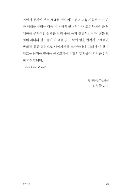신앙의 전수라는 시대적 사명 앞에 서 있는 모든 사역자와 부모에게 분명한 방향을 제시합니다.