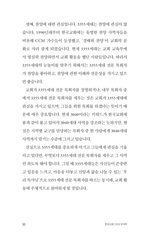 진심으로 3355세대를 중요하게 여기고 그들에게 관심을 기울이고 있다면, 무엇보다 3355세대 전문 목회자를 세우고 그 사역만 하도록 해야 합니다. 그럴 때 3355세대들은 자신들이 존중받고 있음을 느끼고, 마음을 터놓고 신앙과 삶을 나눌 수 있는 ‘우리 목사님’으로 3355세대 전문 목회자를 따르는 동시에, 교회 활동에 주체적으로 참여하게 될 것입니다.