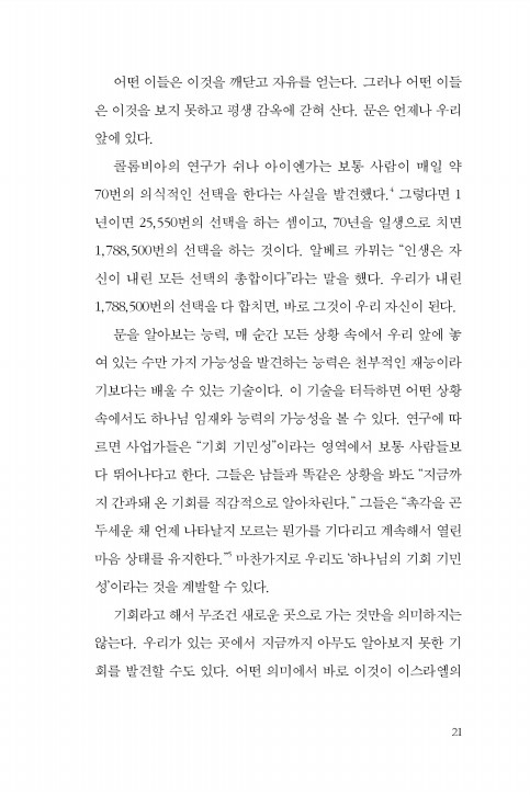 이 책은 이런 미신들을 타파한다. 그리고 열린 문을 알아보고 그곳으로 들어가기를 훈련하라고 권면한다. 매일 우리 앞에 어떤 식으로든 기회가 펼쳐지고, 그것은 하나님이 ‘그분을 위해’ ‘그분과 함께’ 행동하도록 우리에게 주시는 ‘열린 문’이다. 들어가 본 사람만 문 너머에 있는 것을 볼 수 있기에, 모든 열린 문은 오직 믿음으로 들어가는 수밖에 없다. 그러니 선택 훈련은 곧 믿음 훈련이기도 하다.