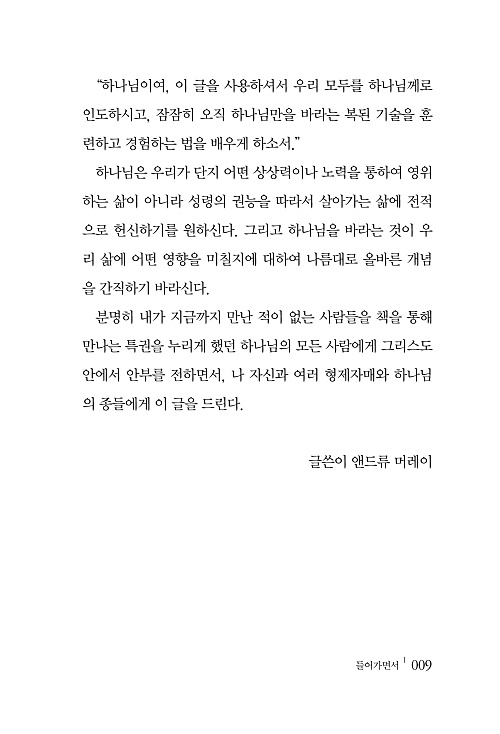 하나님은 사랑이시다. 그것은 당신의 기대감에 대한 단 하나의 유일하고도 모든 것을 충족시키는 보증이다. 사랑은 스스로 찾아 나선다. 하나님의 사랑은 단지 그분의 자녀들에게 그분 자신과 그분의 축복을 나눠주시는 하나님의 기쁨일 따름이다. 하나님이 순복, 순종, 열망, 신뢰 같은 방식으로 우리에게 요구하시는 것은 다음과 같은 한마디에 모두 포함될 수 있다. 곧 오직 하나님만을 바라고 하나님의 은혜를 기다리라. 하나님은 그분 자신을 계시하기 원하시며, 그분 자신으로 우리를 채우기 원하신다. 하나님을 바란다는 것은 그분 자신의 방식과 신성한 능력으로 우리에게 다가오시도록 하나님께 우리의 시간과 공간을 내드리는 것이다.
