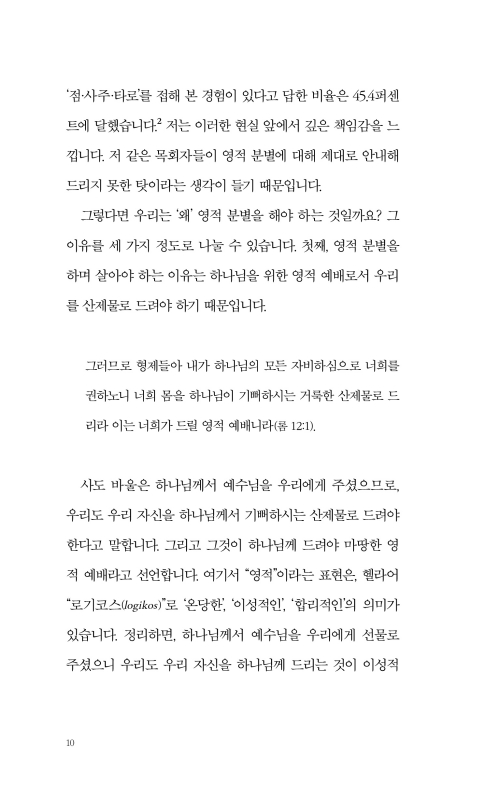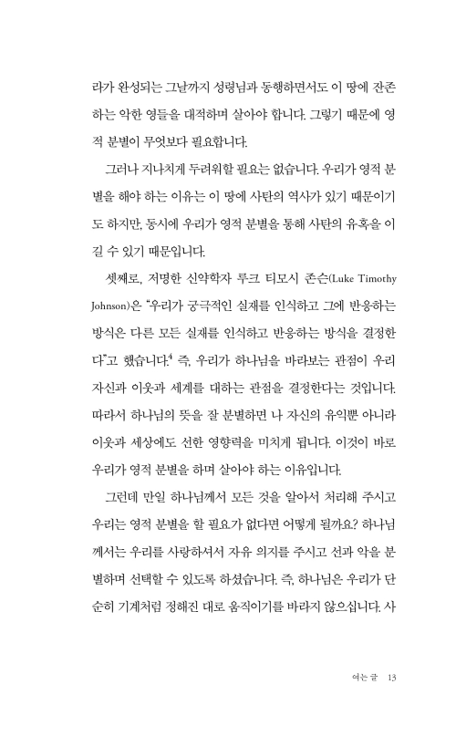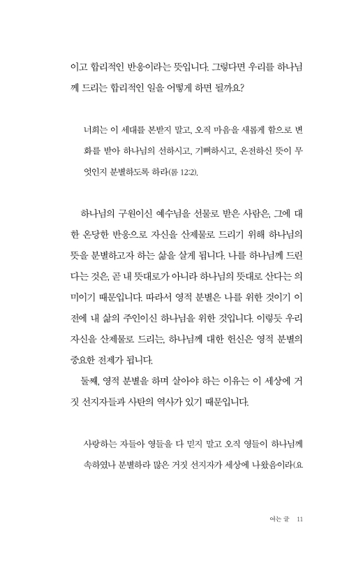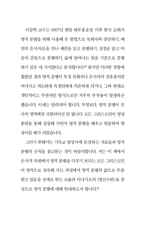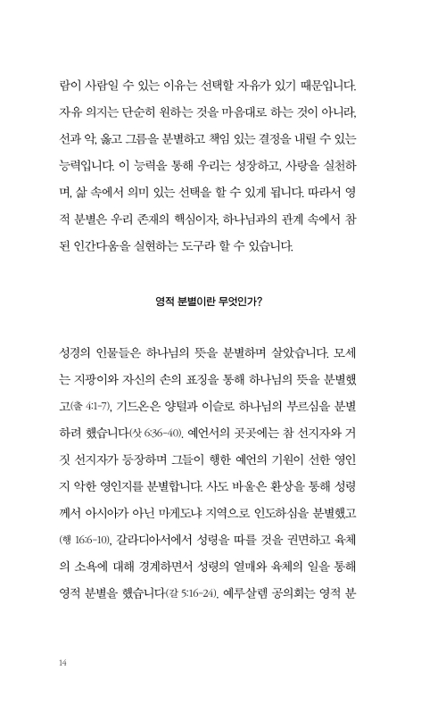 저자는 영적 분별이 특정 은사자의 전유물이 아니라, 모든 그리스도인이 마땅히 추구해야 할 영적 훈련임을 강조합니다. 사도 바울이 권면한 대로, 영적 분별은 "하나님을 위한 영적 예배"이자, "악한 영의 유혹을 이기는 방패"이며, "나와 세상을 향한 선한 영향력"을 미치는 길입니다. 또한 이는 하나님께서 주신 "자유 의지"를 사용해 선과 악을 분별하고 책임있는 결정을 내림으로써 "참된 인간다움을 실현하는 도구"가 됩니다.