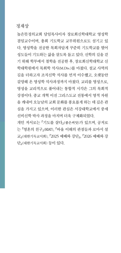 이 책은 출간 전부터 이미 영성학 권위자들의 호평을 받았습니다. 유해룡 명예교수(장로회신학대학 영성학)는 "성숙을 향해 날마다 나아가는 삶을 갈망하는 모든 그리스도인에게 적극 추천할 만한 책"이라고 평했으며, 김기석 원로 목사(청파교회)는 "영적인 혼돈이 지극한 한국 교회에 선물과도 같은 책이라 생각한다"고 강력하게 추천했습니다. 저자 정재상 목사는 이 책을 통해 모든 그리스도인이 분별력을 훈련하여 영적 성숙에 다다르기를 간절히 바라고 있습니다. 『영적 분별을 살다』는 혼란스러운 세상 속에서 흔들리지 않고 하나님의 뜻을 따라 순례의 길을 걷고자 하는 모든 성도에게 견고한 영적 나침반이 될 것입니다.
