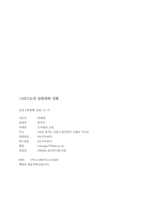 아무쪼록 이 책을 통하여 믿음의 여정에서 흔들리지 않도록 붙잡아 주는 영적 나침반이 되기를 기도합니다. 그리고 마침내 주님과 함께 영원한 안식과 천국의 기쁨을 누리는 그날까지, 하나님을 신뢰하며 끝까지 걸어가시기를 예수님의 이름으로 축복합니다.