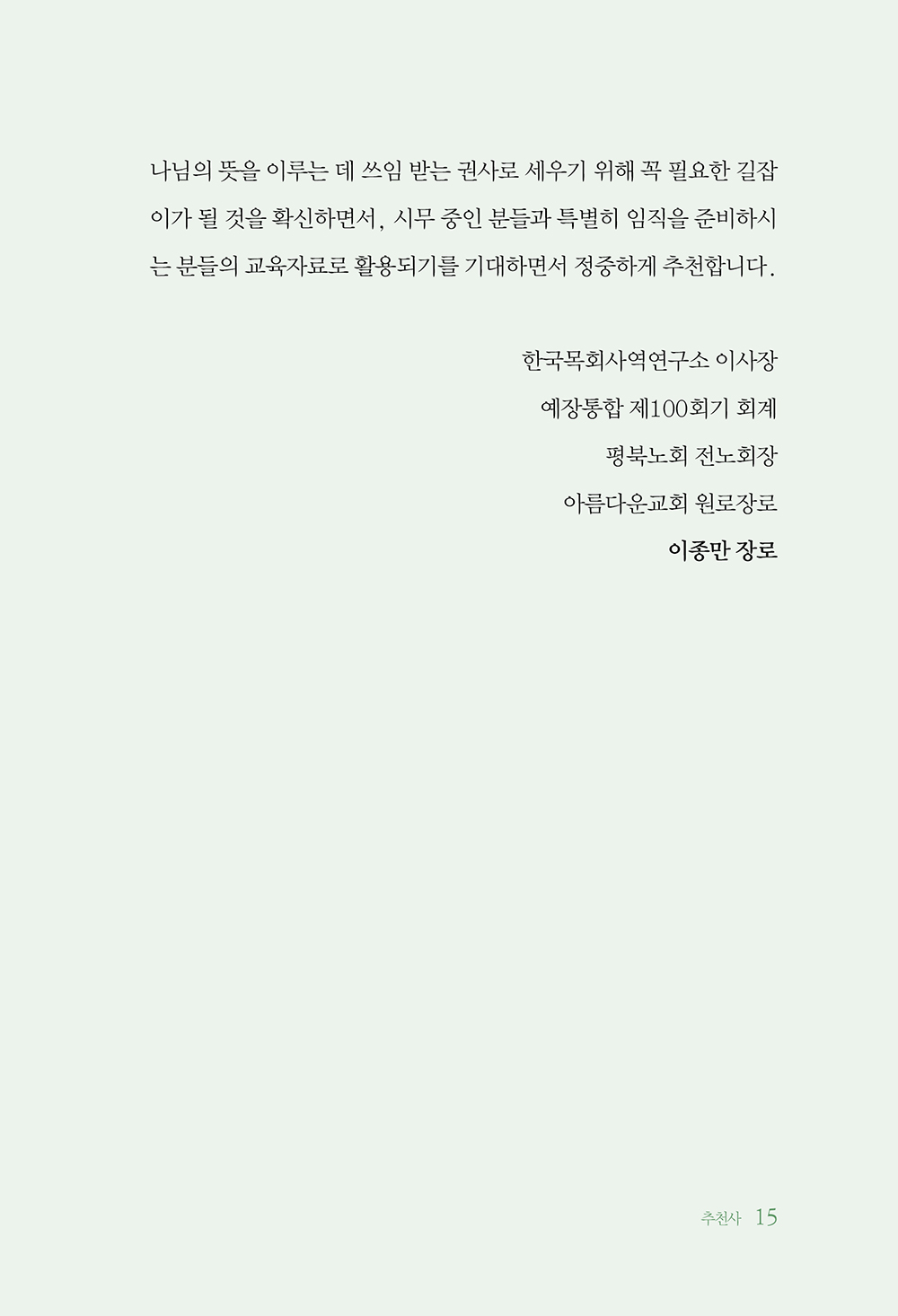 이 책은 목회자의 지근거리에서 목회자의 교회 섬김의 보조자로서의 권사가 자신의 역할을 다함으로 건강한 교회를 세우고 이 땅에 하나님 나라를 확장하는 데 기여하게 하여 하나님께 영광을 돌리고 하나님의 뜻을 이루는 데 쓰임 받는 권사로 세우기 위해 꼭 필요한 길잡이가 될 것을 확신하면서, 시무 중인 분들과 특별히 임직을 준비하시는 분들의 교육자료로 활용되기를 기대하면서 정중하게 추천합니다.