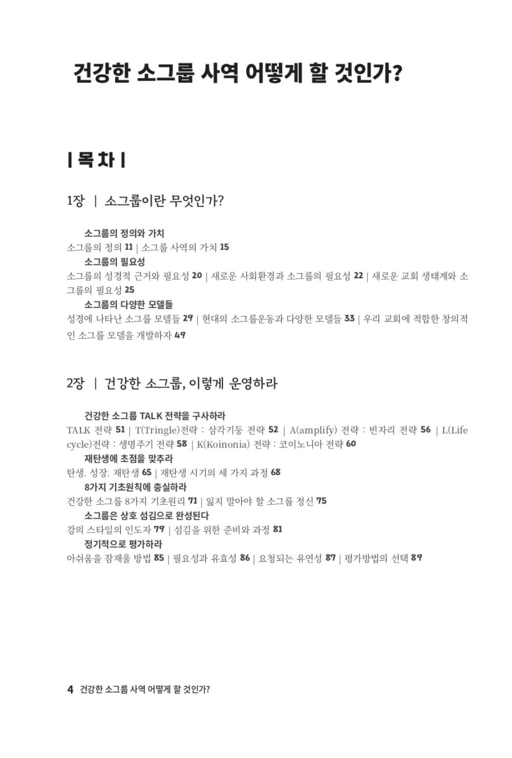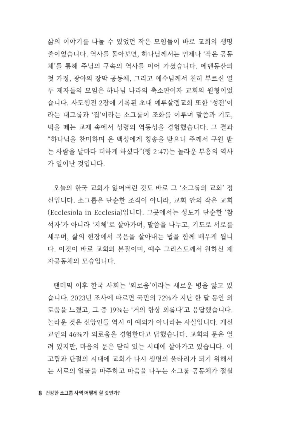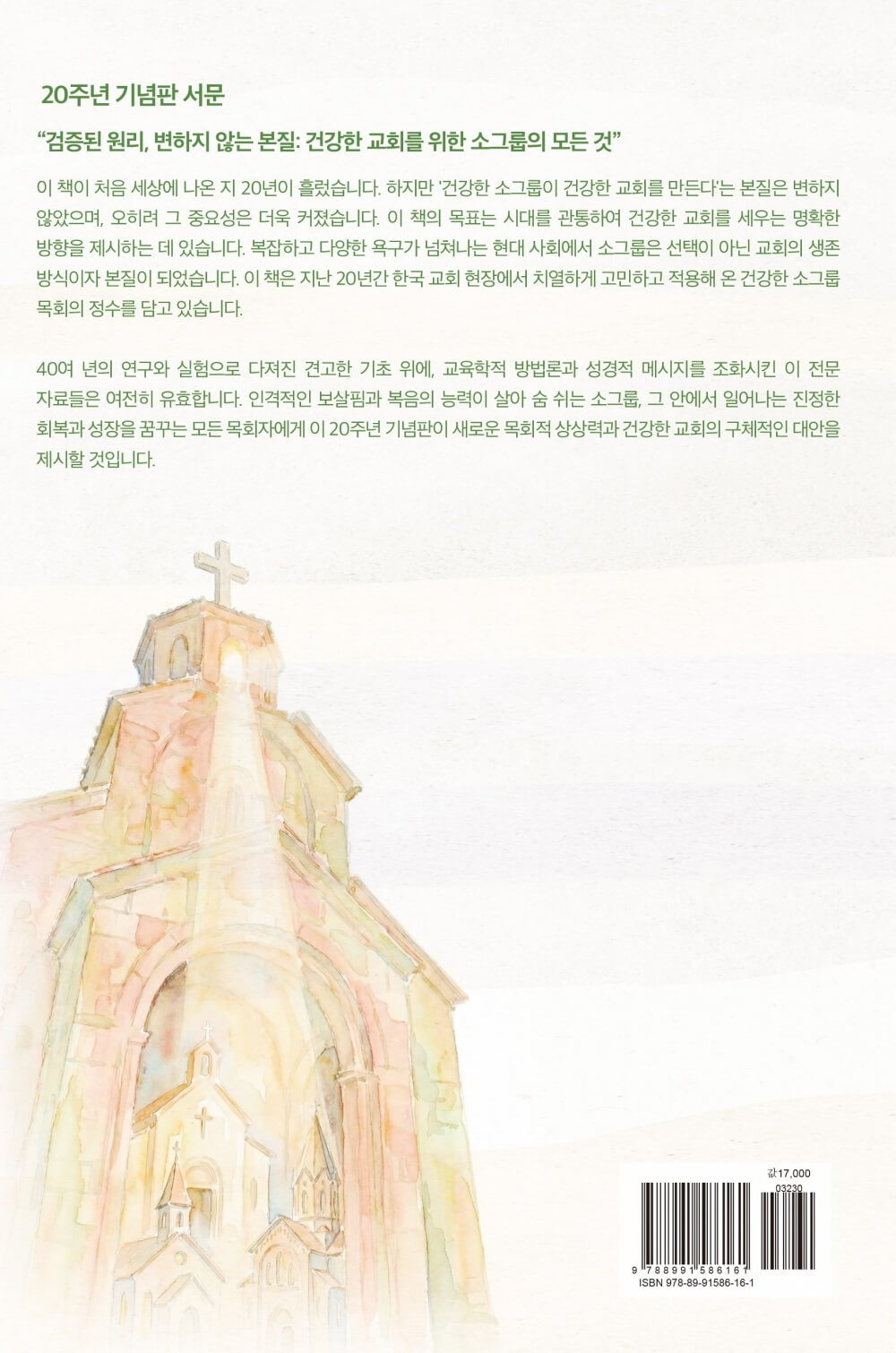 이 책이 처음 세상에 나온 지 20년이 흘렀습니다. 하지만 '건강한 소그룹이 건강한 교회를 만든다'는 본질은 변하지 않았으며, 오히려 그 중요성은 더욱 커졌습니다. 이 책의 목표는 시대를 관통하여 건강한 교회를 세우는 명환학 방향을 제시하는데 있습니다. 복잡하고 다양한 욕구가 넘쳐나는 현대 사회에서 소그룹은 선택이 아닌 교회의 생존방식이자 본질이 되었습니다. 이 책은 지난 20년간 한국 교회 현장에서 치열하게 고민하고 적용해 온 건강한 소그룹 목회의 정수를 담고 있습니다.