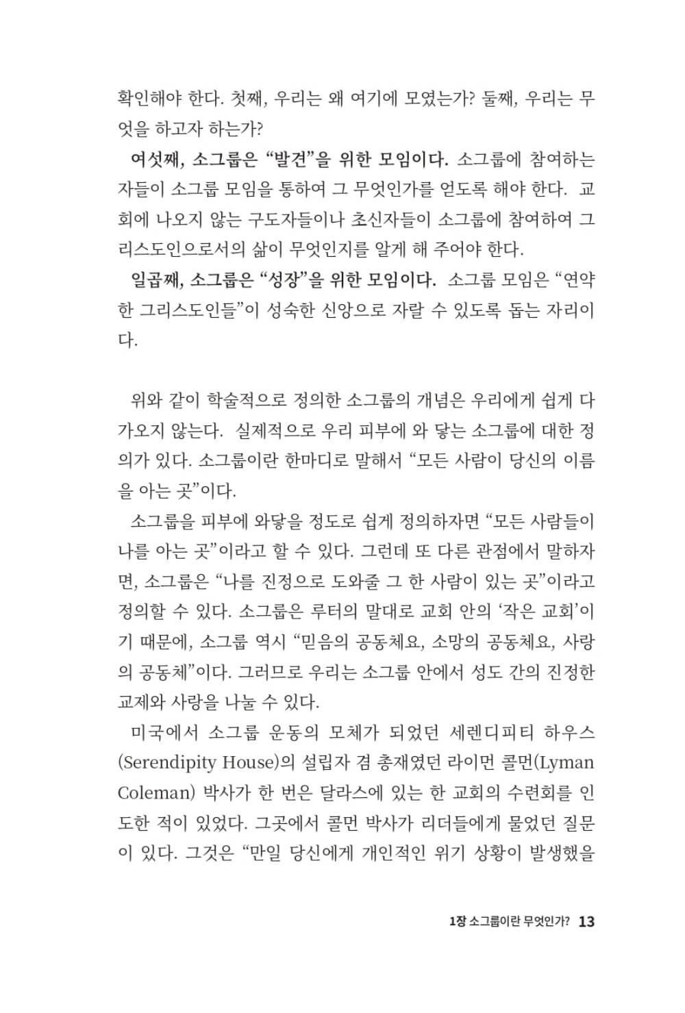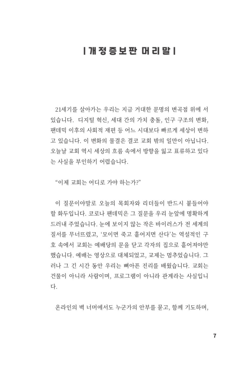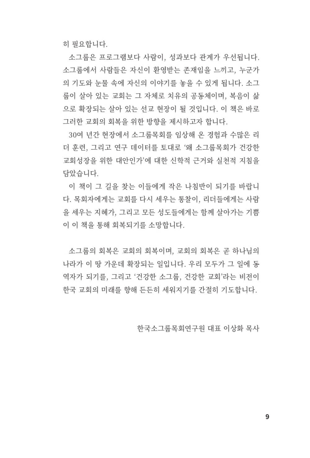 이 책이 처음 세상에 나온 지 20년이 흘렀습니다. 하지만 '건강한 소그룹이 건강한 교회를 만든다'는 본질은 변하지 않았으며, 오히려 그 중요성은 더욱 커졌습니다. 이 책의 목표는 시대를 관통하여 건강한 교회를 세우는 명환학 방향을 제시하는데 있습니다. 복잡하고 다양한 욕구가 넘쳐나는 현대 사회에서 소그룹은 선택이 아닌 교회의 생존방식이자 본질이 되었습니다. 이 책은 지난 20년간 한국 교회 현장에서 치열하게 고민하고 적용해 온 건강한 소그룹 목회의 정수를 담고 있습니다.