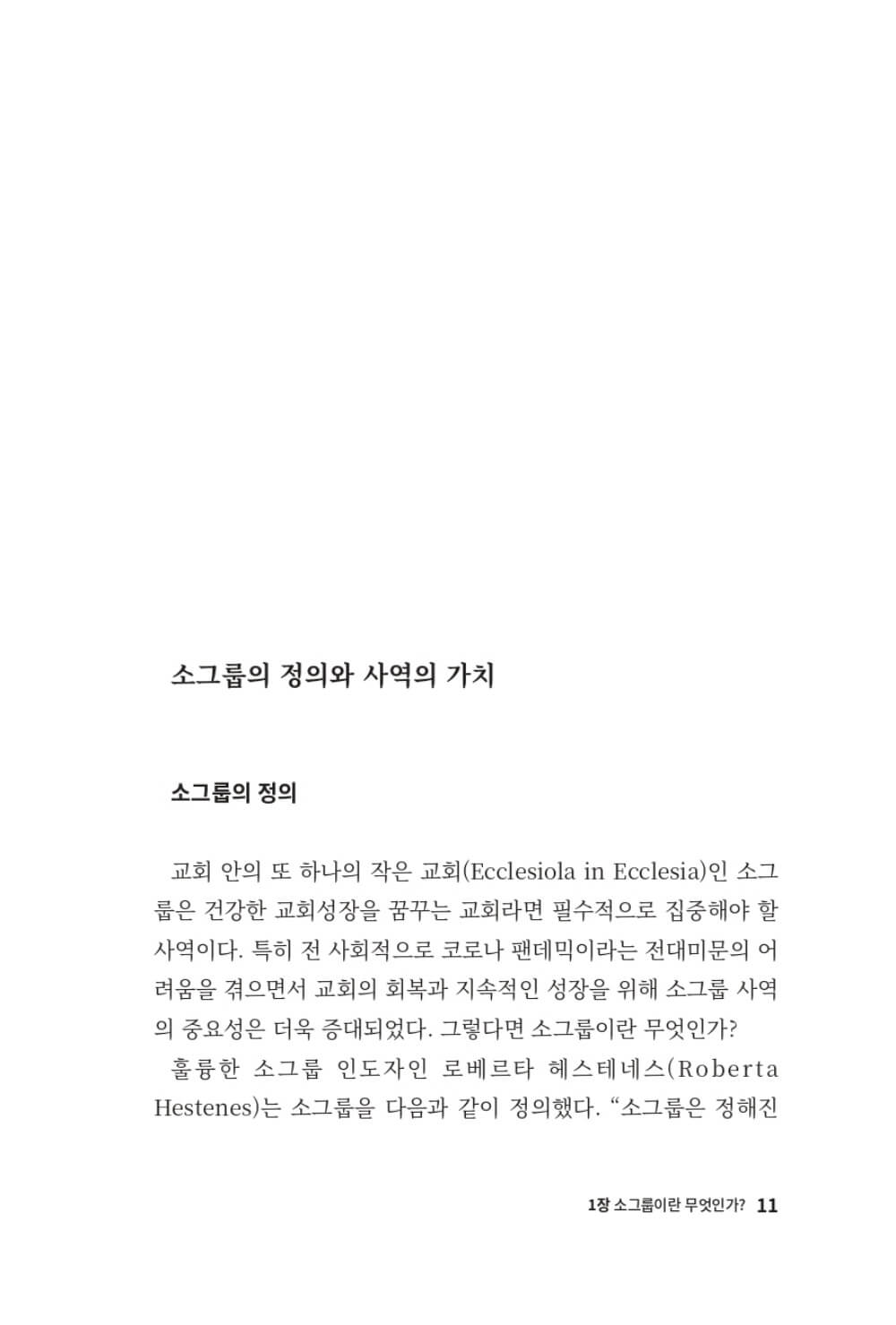 교회 안의 또 하나의 작은 교회(Ecclesiola in Ecclesia)인 소그룹은 건강한 교회성장을 꿈꾸는 교회라면 필수적으로 집중해야 할 사역이다. 특히 전 사회적으로 코로나 팬데믹이라는 전대미문의 어려움을 겪으면서 교회의 회복과 지속적인 성장을 위해 소그룹 사역의 중요성은 더욱 증대되었다. 그렇다면 소그룹이란 무엇인가?