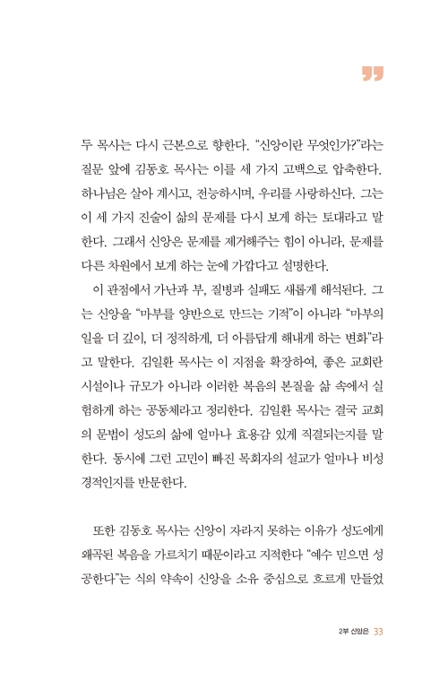 사실 ‘신앙’과 함께 ‘가난’을 말하는 것은 ‘주례’와 ‘장례’를 동시에 치르는 것 같은 일이다. 교회 안에 가장 쓸모없는 거짓말은, 신앙으로 가난을 정당화하거나 가난을 개인의 믿음 부족으로 여기는 환원 문법이다. 동일하게 부(富)를 접근하는 태도도 마찬가지리라. 나는 감히, 김동호 목사님을 나의 자리로 불러냈다. 그 분은 조국 교회에 돈에 대해 가장 많이, 가장 직설적으로 설교해오신 분이다. 나는 나의 자리에서 때로는 거칠게, 때로는 어리석게, 그리고 때로는 아프게 질문을 드렸다. 그러나 이건 나만의 질문이 아니라, 신앙과 현실 사이에서 씨름하는 모두의 질문이기도 하리라. 흥미로운 점은 이 대담이 곧바로 ‘가난’을 논하지 않고, ‘돈이란 무엇인가?’라는 보다 더 근본적인 질문으로 나아간다는 데 있다. 돈을 어떻게 이해하느냐에 따라 가난과 부를 대하는 태도 역시 달라지기 때문이다. 그러니 이 대담집은, 돈을 신앙의 바깥으로 밀어내는 대신 신앙 안에서 사유할 수 있는 대상으로 불러온다.