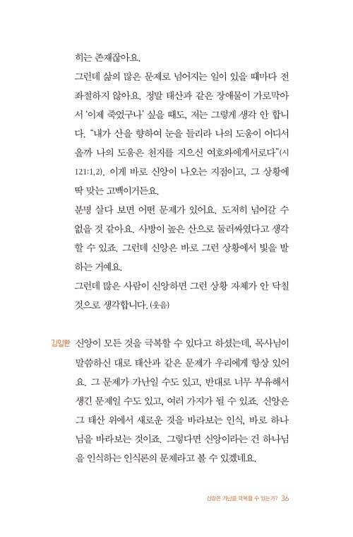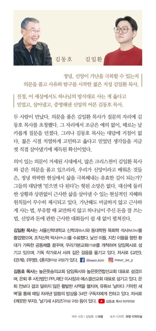 한국교회에서 ‘돈 이야기 제일 잘하는 목사님’으로 알려진 신앙의 어른 김동호 목사와 젊은 기독 작가 김일환 목사가 만나 ‘신앙은 정말 가난을 극복할 수 있는지’에 관한 유의미한 대화를 나눴다. ‘가난’은 성도의 삶과 가장 맞닿아 있는 주제임에도 신앙 담론에서 의외로 찾아보기 어려운 주제이기도 하다.