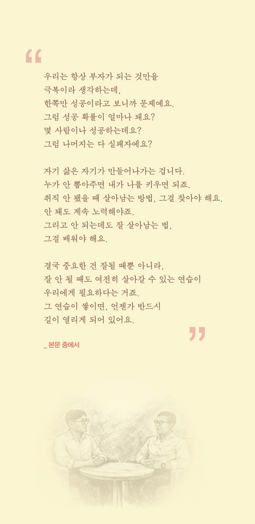 우리는 항상 부자가 되는 것만을 ‘극복ʼ이라 생각하는데, 한쪽만 성공이라고 보니까 문제예요. 그럼 성공 확률이 얼마나 돼요? 몇 사람이나 성공하는데요? 그럼 나머지는 다 실패자예요? 자기 삶은 자기가 만들어나가는 겁니다.