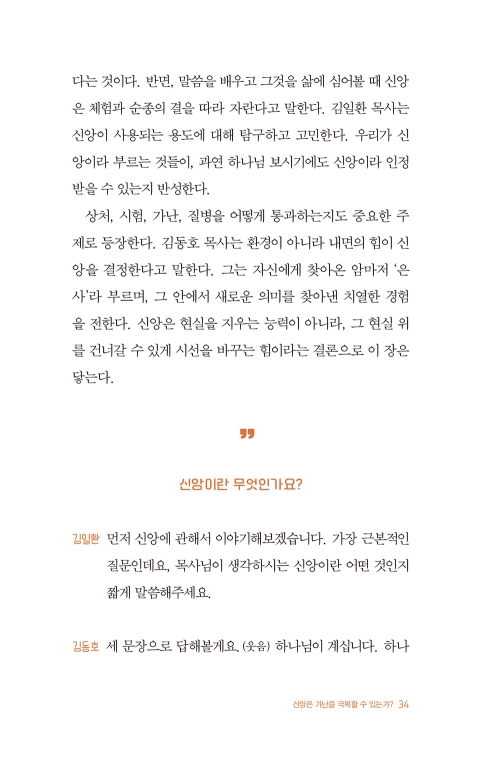 이 책에서 두 사람은 어렵다고 회피하는 대신 정면으로 맞아들여 사려 깊은 질문과 담백한 대화를 이어나간다. 그 대화는 신앙과 돈, 가난과 부 그리고 삶을 대하는 태도를 점검하며, 어떤 형편에서도 비굴하거나 오만해지지 않는 것, 신앙 안에서 품위 있는 선택을 해내는 것이 진정한 극복이라는 결론을 도출한다. 그리고 이 모든 대화의 정점이자 흔들리지 않는 중심인 복음으로 향한다. 복음이 흔들리지 않는 중심으로 자리할 때 우리는 환경에 매이는 대신 오늘을 충실히 살아낼 수 있으며, 하나님이 주시는 현재의 기회를 붙잡을 수 있게 된다.