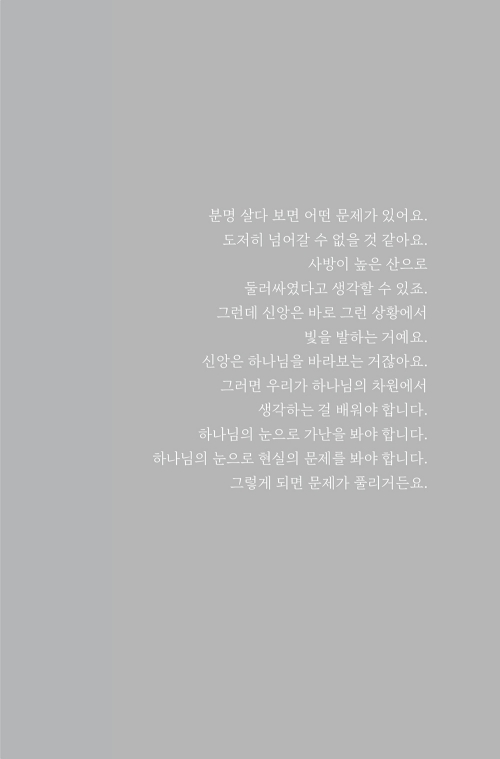 신앙은 하나님을 바라보는 거잖아요. 그러면 우리가 하나님의 차원에서 생각하는 걸 배워야 합니다. 하나님의 눈으로 가난을 봐야 합니다. 하나님의 눈으로 자기 현실의 문제를 봐야 합니다.