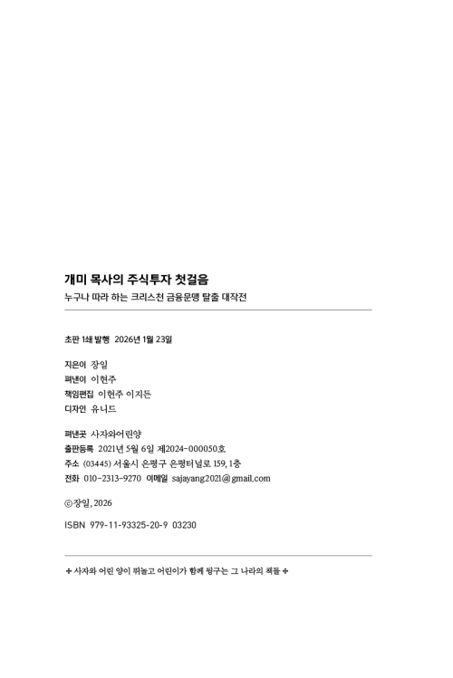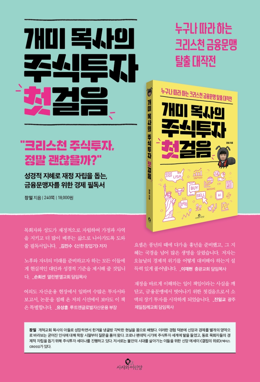 이 책은 평범한 개미 투자자이자 한 가정의 가장, 그리고 지역교회 목회자의 시선으로 써 내려간 이야기입니다. 주식투자에 관심은 있지만 막연한 선입견이나 두려움 때문에 쉽게 시작하지 못했던 분들, 이미 시장에 참여하고 있으나 신앙의 관점에서 투자를 어떻게 이해하고 실천해야 할지 고민하는 분들, 더 나아가 안정적인 장기 투자를 통해 자산 형성과 노후 준비를 차분히 계획하고자 하는 분들께 이 책을 권하고 싶습니다. 이 여정이 투자를 향한 용기를 북돋는 동시에, 성경적 가치와 기준 위에서 신앙과 재정을 함께 세워 가는 소중한 첫걸음이 되기를 기대합니다.