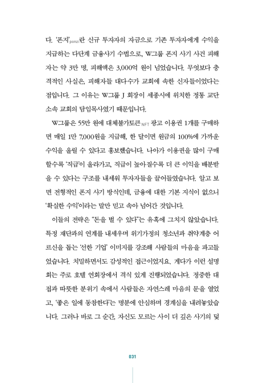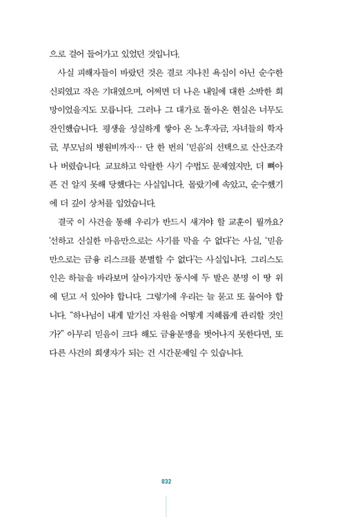 그러나 이미 많은 성도들이 투자에 참여하고 있는 현실 속에서, 단순히 ‘하지 말라’는 실효성 없는 메시지를 반복하는 것이 과연 목회적으로 책임 있는 태도인지 질문하게 되었습니다. 오히려 지금 필요한 것은 투자를 정죄하거나 외면하는 것이 아니라, 성경적 가치에 근거해 어떤 원칙과 기준으로 시장에 참여해야 하는지를 함께 고민하고 안내하는 일이라고 생각했습니다. 그런 문제의식이 결국 이 책을 쓰게 된 가장 큰 이유였습니다.